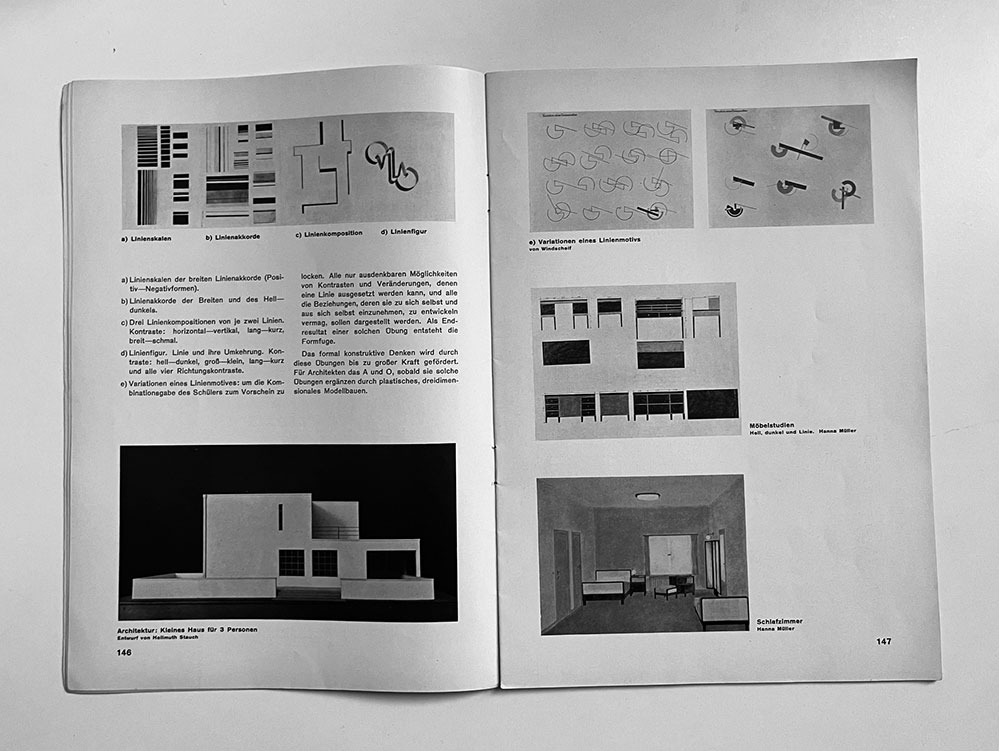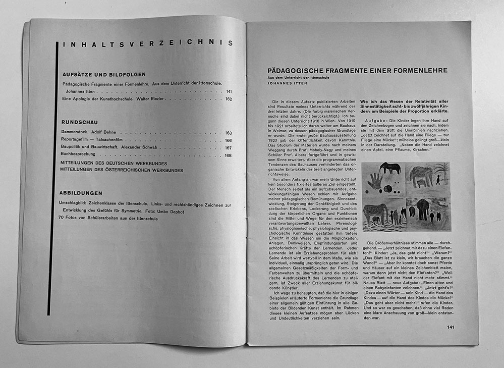 Die Ausgabe der Form 1930, Heft 6, beschäftigt sich fast nur mit einem Thema - der Itten-Schule in Berlin. Diese Kunstschule wurde 1926 von Johannes Itten gegründet, zahlreiche Bauhäusler wie Fred Forbát, Friedrich Köhn, Lucia Moholy-Nagy, Georg Muche, Julius Pap oder der Fotograf Umbo lehrten an der Schule. Von Umbo stammt auch das Coverfoto der Zeitschrift DER FORM, dass den beidhändigen Zeichenuntericht in der Itten-Schule zeigt. Mittig findet sich unter der japanischen Kalligraphie der sogenannte Itten-Hocker, der 2024 von Markanto wieder aufgelegt wurde. Heute sind nur noch zwei originale Hocker aus der Itten-Schule bekannt, die sich im Besitz der Familie finden.