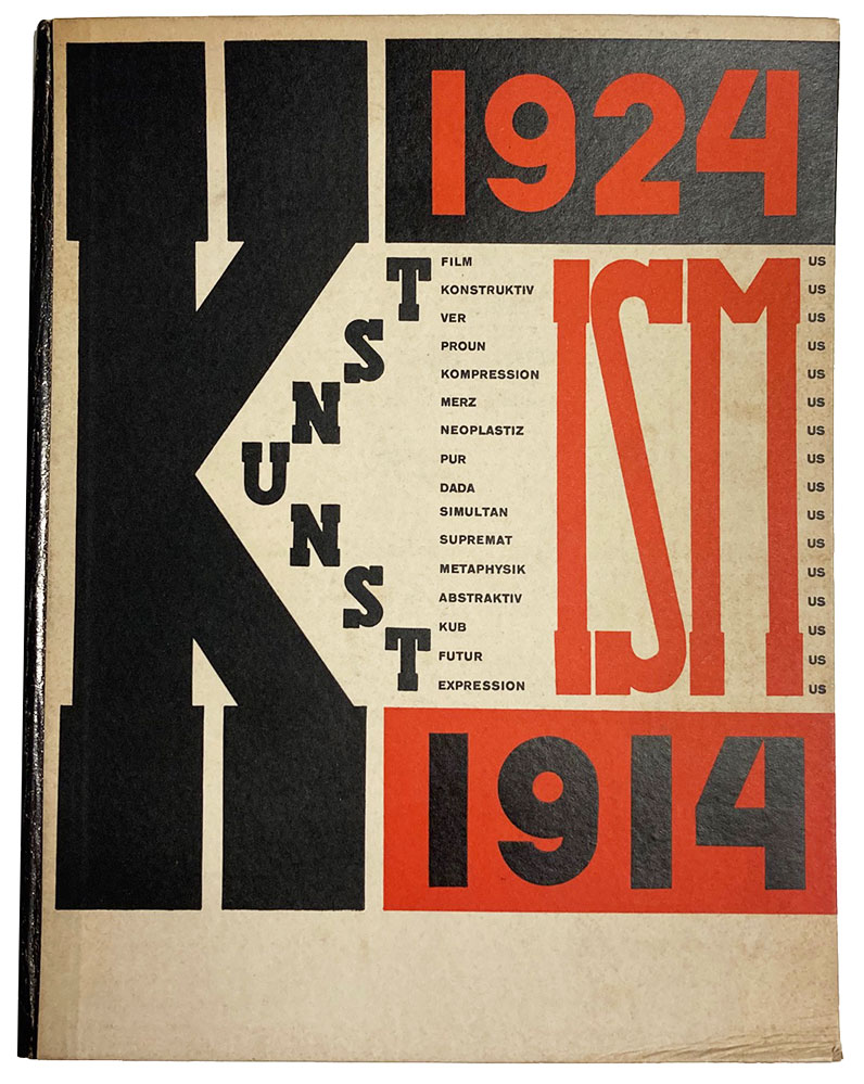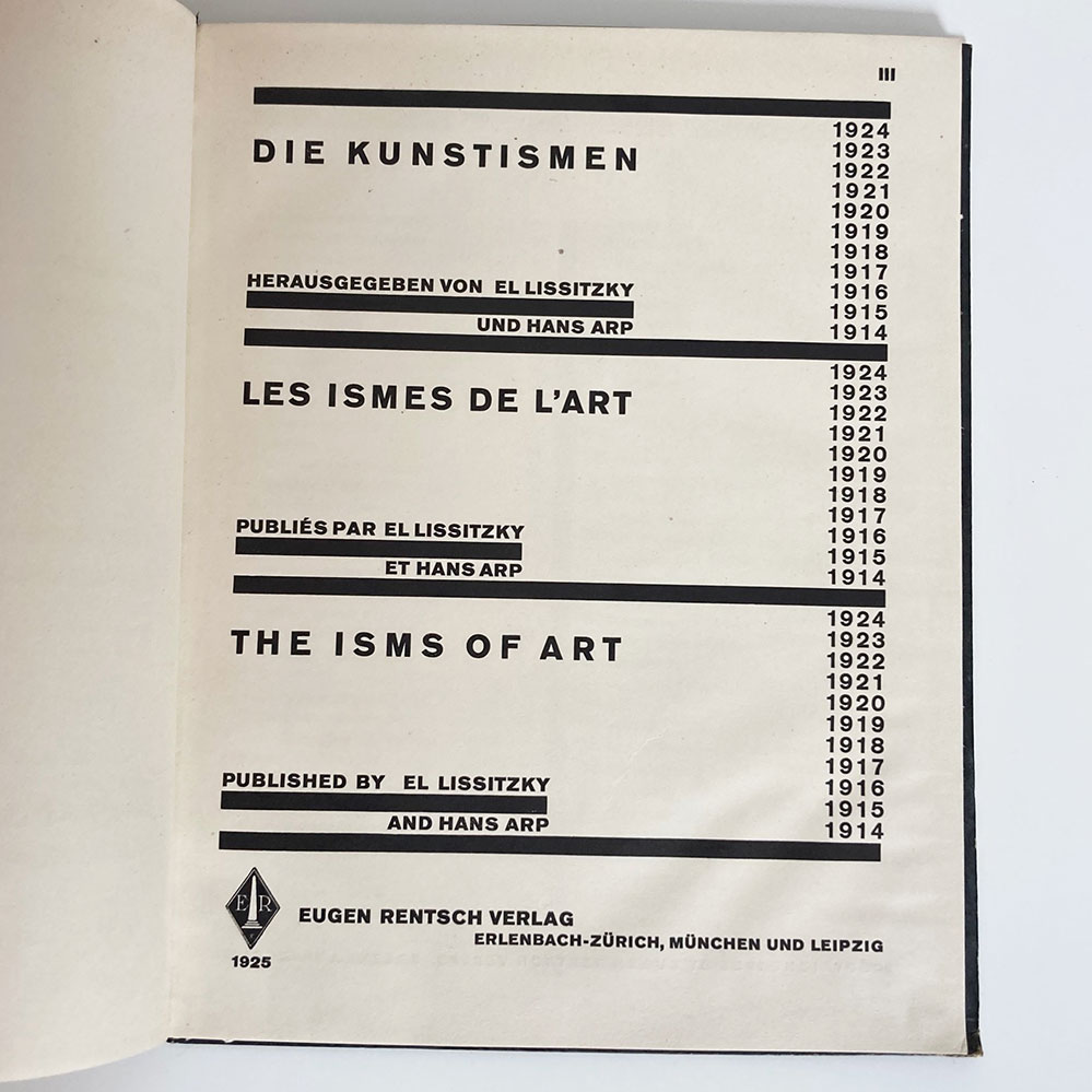 1925 erschien das dreisprachige Buch „Die Kunstismen 1914 - 1924” als Gemeinschaftswerk von Hans Arp und El Lissitzky. Das Buch gilt als sehr bedeutende Streitschrift über die Kunst des frühen 20. Jahrhunderts, verantwortlich für Typographie und Layout war El Lissitzky. Vor allem die Titelgestaltung gilt als eine seiner besten typografischen Arbeiten.