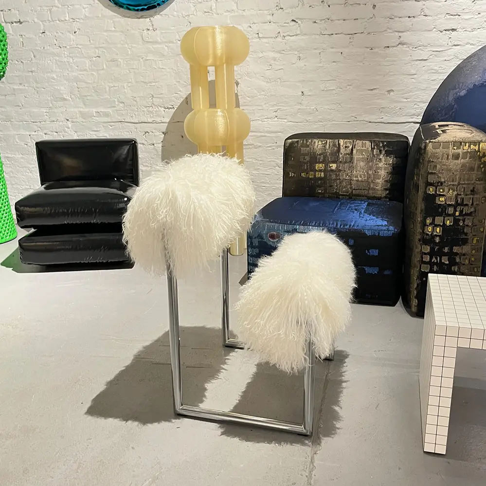 - Polsterung aus mongolischem Ziegenfell in den Farben Weiß, Schwarz und Rost