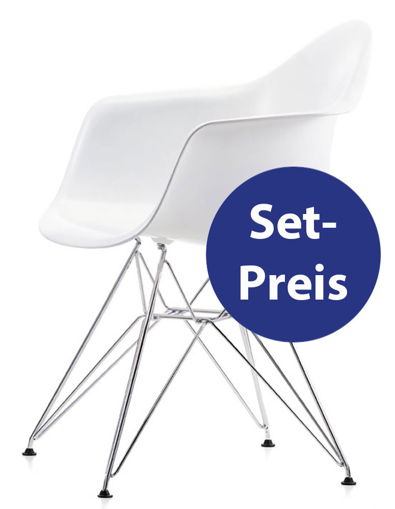 Bestellen Sie die DAR Eames Plastic Arm Chairs als 4er Set und erhalten Sie 10% Rabatt. Der Plastic Arm Chair RE DAR (Dining Height Armchair Rode Base) vmit dem Eiffel-Tower-Untergestell gehört zu den ersten Kunststoffmöbeln überhaupt und ist einer der erfolgreichsten und beliebtesten Stühle der Eames Plastic Chairs. Das Untergestell mit dem Spitznamen „Eiffel-Tower” ist wahlweise verchromt oder schwarz und weiß pulverbeschichtet erhältlich. Ab 1948 entwarfen Charles und Ray Eames Sitzmöbel aus Fiberglas, die zu den ersten industriell gefertigten Stühlen aus Kunststoff zählten. Ursprünglich wurden die Stühle von Zenith Plastics für Herman Miller produziert, später dann in Europa von Vitra hergestellt. Neben dem Einsatz von Fiberglas für die organisch geformten Sitzschalen zeichneten sich diese Sitzmöbel durch die Kombination von verschiedenen Untergestellen aus. Die Eames Plastic Chairs beinhalten dabei zwei verschiedene Schalentypen (für Arm Chair Shell und Side Chair Shell).
