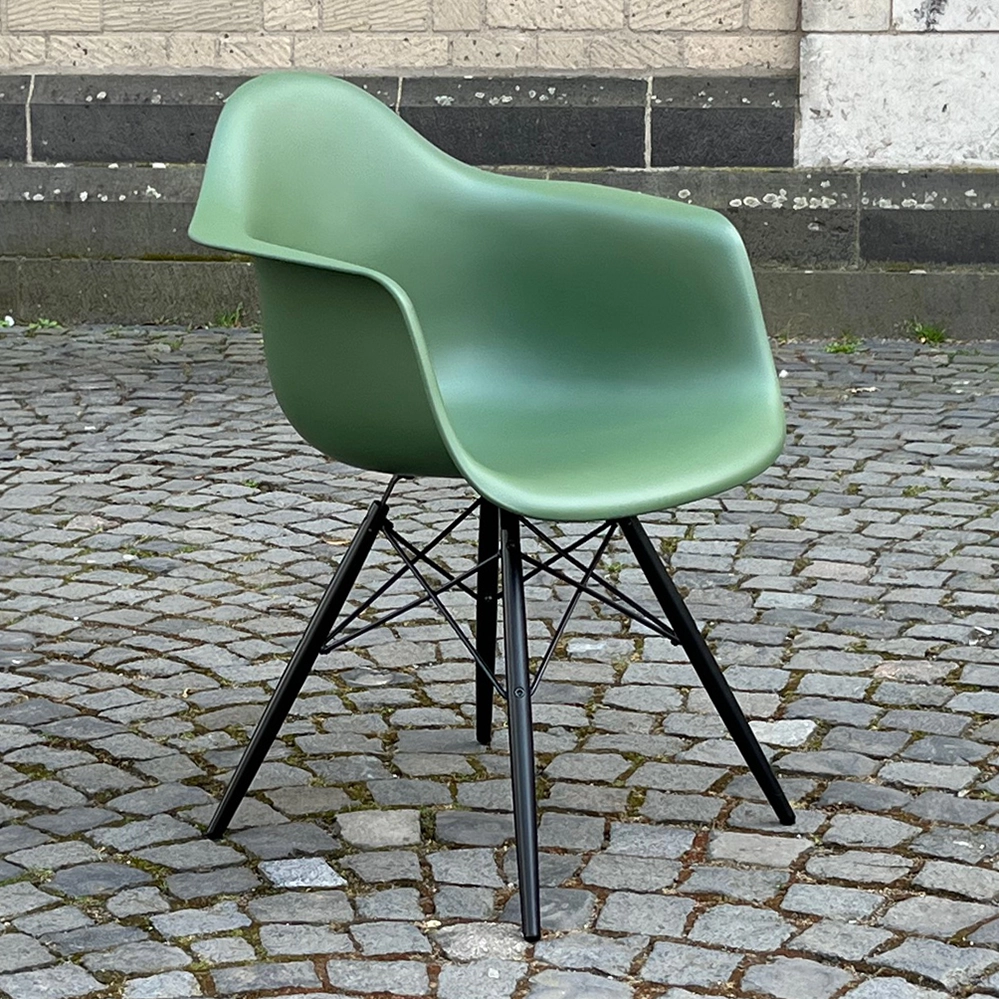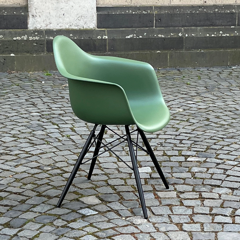 - Durchgefärbte Sitzschale aus recyceltem Polypropylen in Forest Green, der recycelte Kunststoff stammt von gebrauchten Verpackungen aus Deutschland, die Sitzschalen der Eames Plastic Chairs RE können daher kleine Farbsprenkel enthalten