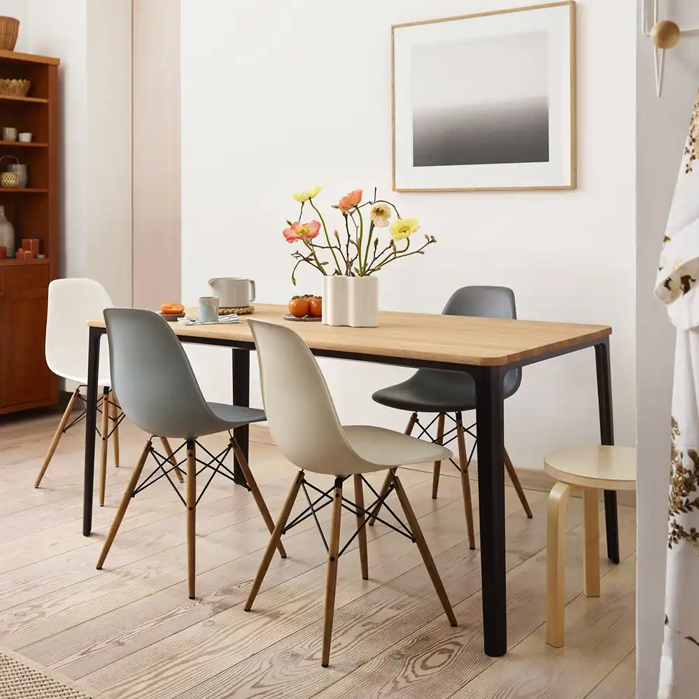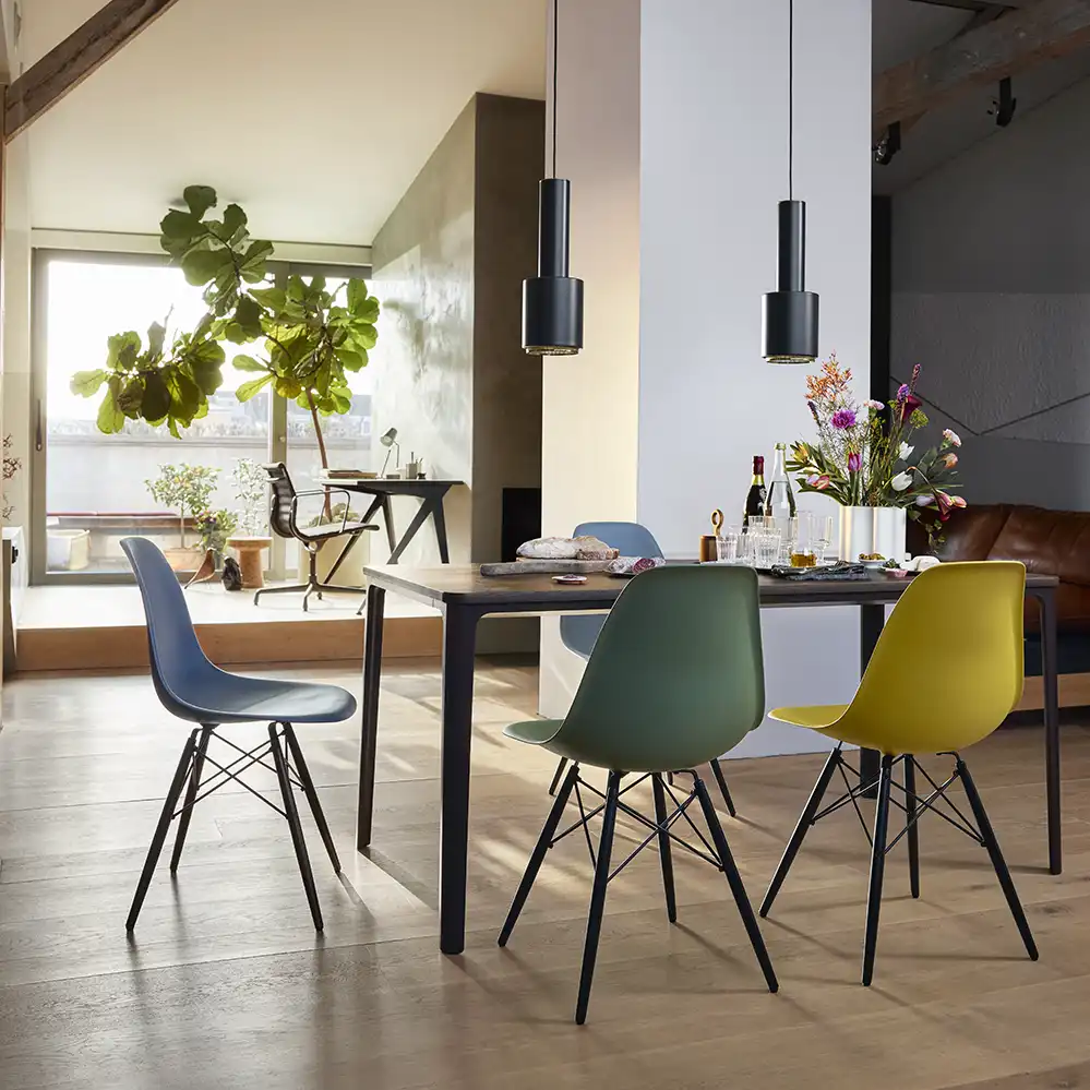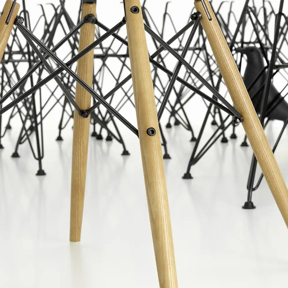 Der Eames Plastic Side Chair RE DSW ist bei Vitra mit vier verschiedenen Holzuntergestellen (3 x Ahorn und 1 x Esche) erhältlich. Die zeitlose Designikone von Charles und Ray Eames begeistert durch die Materialkombination von Kunststoff und Holz. Auch historisch ist der Entwurf aus dem Jahr 1949/50 sehr interessant, zählt er doch zu den ersten Kunststoffmöbeln überhaupt. Der Produktname DSW steht übrigens für Dining Height Side Chair Wooden Base.