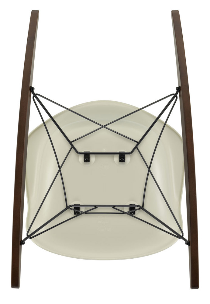 - Eames Rocker mit dunklen Ahornkufen und weißem Drahtgestell