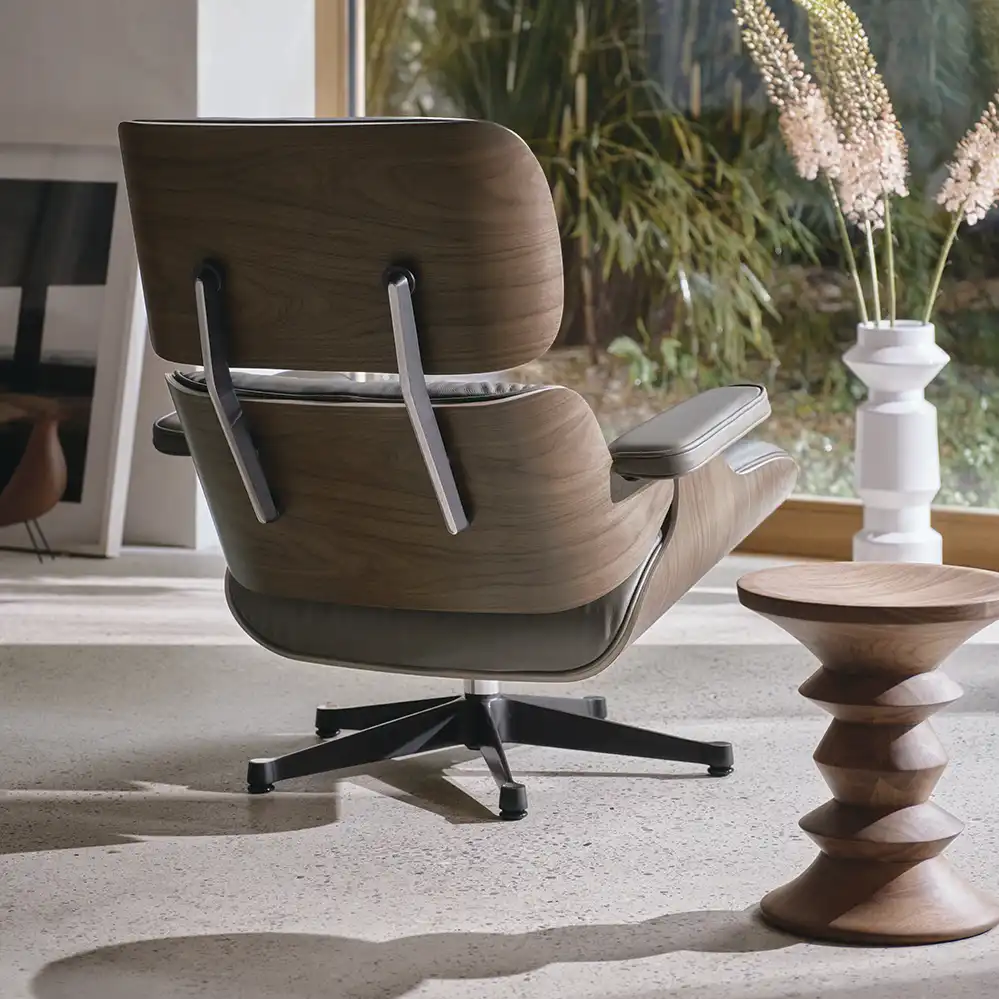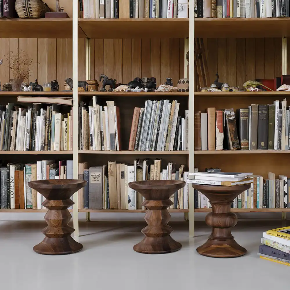 Der Eames Stool A ist unser Liebling der dreiteiligen Serie von Vitra. Die Stools wurden ursprünglich von Ray Eames im Jahr 1960 für die Lobby des Rockefeller Centers in New York entworfen. Die Sitzflächen dieser Stools sind so gestaltet, dass sie eine bequeme Sitzfläche formen – aber nicht so tief, dass eine Teetasse umkippen und verschüttet werden könnte. Dabei erwecken die Hocker zahlreiche Assoziationen - angefangen von afrikanischen Sitzmöbeln bis hin zu abstrakten Schachfiguren. Die archaisch wirkenden Eames Stools greifen die minimalistischen Ursprünge des Sitzens auf. Charles und Ray Eames nannten die massiven Nussbaum-Hocker selbst Perchers, da sie auch als kleine Tische oder als Sitzgelegenheiten für kurze Zeit verwendet werden konnten. In ihrem Haus in Los Angeles fanden die Hocker oft Verwendung. Es gibt die Eames Stools in drei verschiedenen Ausführungen, die sich in der Form des Mittelteils leicht unterscheiden. Gedrechselt aus massiven Holz sind die Hocker trotz ihrer Sitzmulde als kleiner Ablagetisch gedacht. So eignen sie sich ideal für den Eames Lounge Chair.