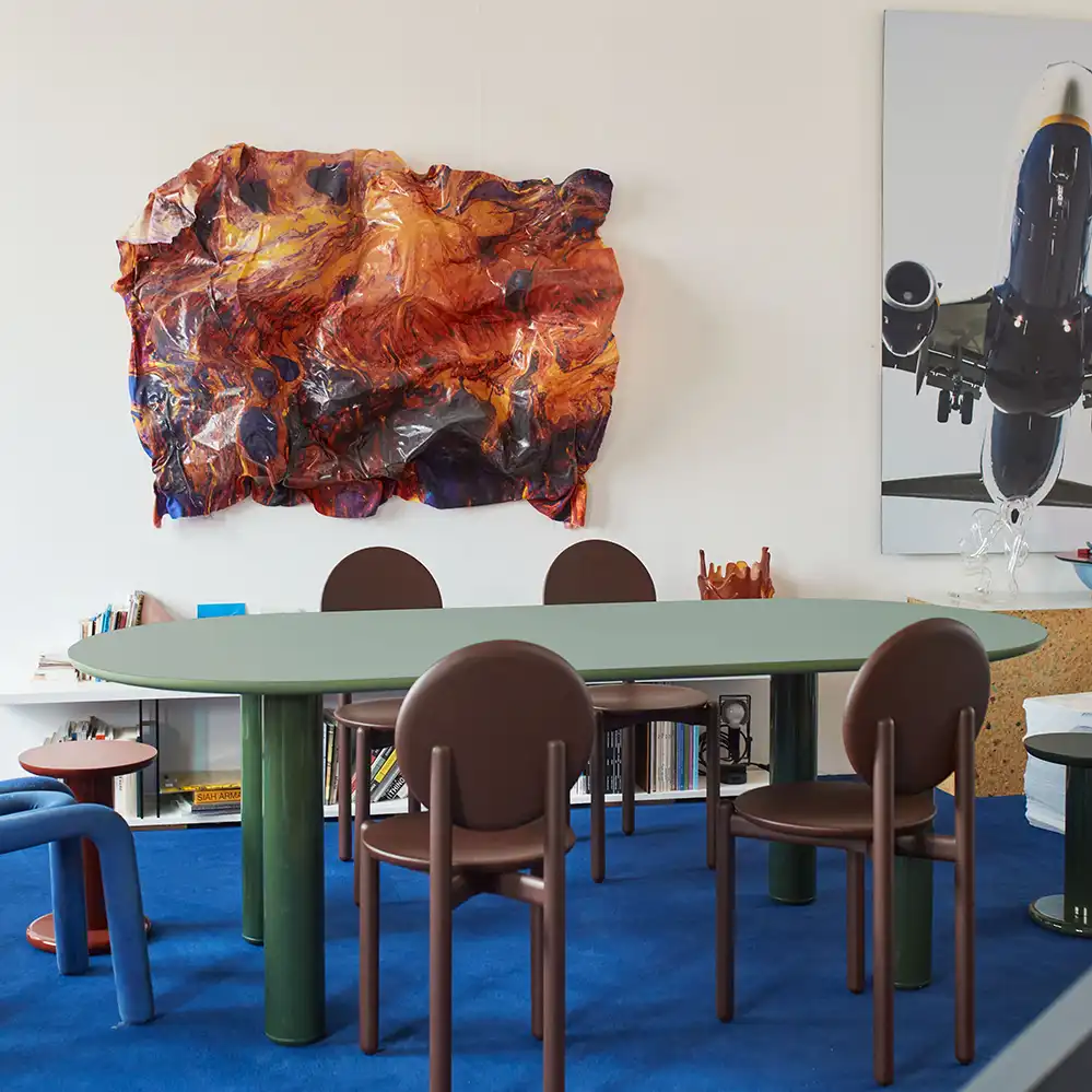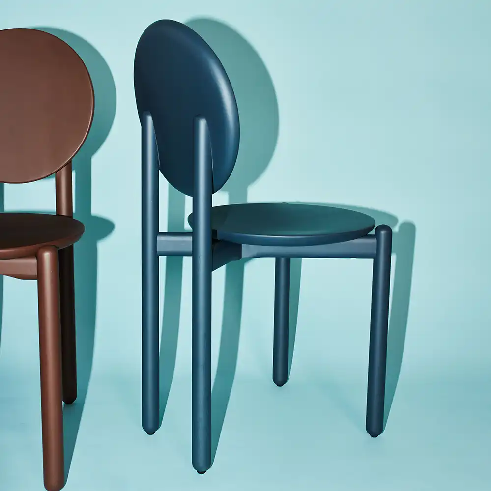 Der Eclipso Stuhl von Jaime Hayon überzeugt durch klare Formen und sanfte Rundungen, die ihm eine leichte, schwebende Anmutung verleihen. Sitzfläche und Rückenlehne aus formgepresstem Schichtholz ruhen auf einem stabilen Aluminiumrahmen mit pulverbeschichteter Satin-Oberfläche, farblich abgestimmt auf die massiven Buchenholzbeine. Erhältlich in vier warmen Holzfarbtönen – Braun, Blau, Beige und Grün