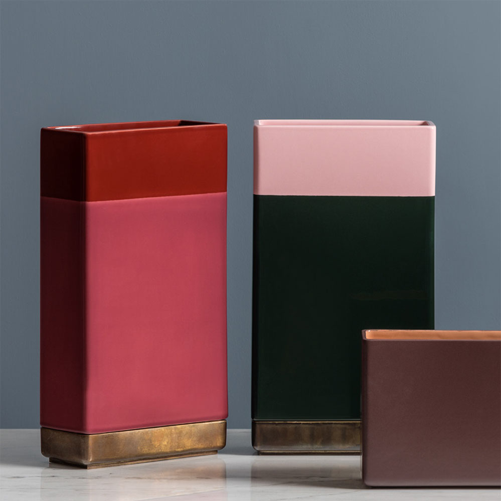 Die rechteckige Vase Equilibri DIM6 von Bitossi zählt zu einer Kollektion, die von dem Mailänder Innenarchitekten Dimorestudio um 2016 entworfen wurde. Dabei kombiniert der Entwurf Messingelemente und Keramik.