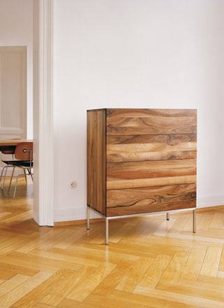 Die 90 cm hohe Massivholzkommode Fatima von e15 ist wahlweise Eiche oder Nussbaum erhältlich. Auf der Innenseite der Türen werden Nuten eingefräst, um dem Holz die Spannung zu nehmen, die bei dieser Konstruktion mit Massivholz entsteht. Das Material des Massivholz-Korpus ist 2 cm stark. Eingelassene Aluminiumleisten machen die Kommode belastbar und ermöglichen eine Massivholzfront ohne weitere sichtbare Rahmenkonstruktion. Der Entwurf von Philipp Mainzer stammt aus dem Jahr 2002.