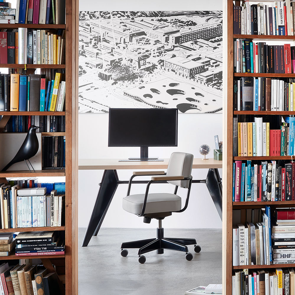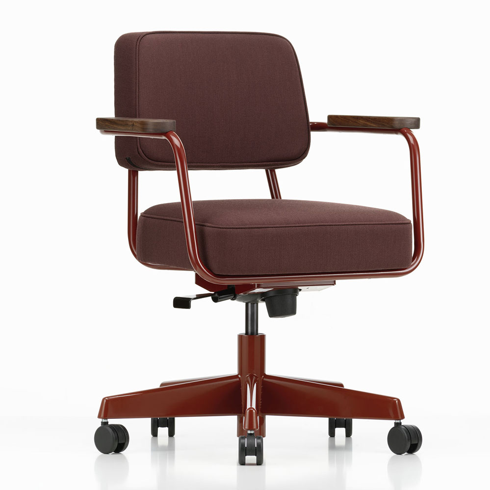 Die drehbare Variante des Chefsessels von Jean Prouvé aus dem Jahr 1951 wurde erstmalig 2015 im Rahmen der RAW Office Edition aufgelegt, dabei wurden die technischen Voraussetzungen an die heutige Bürowelt angepasst. Der höhenverstellbare Drehstuhl Fauteuil Direction Pivotant verfügt über eine regulierbare Rückneigemechanik und Doppelrollen. Der 5-Sternefuß ist dabei aus dem für Prouvé typischen Stahlblech.