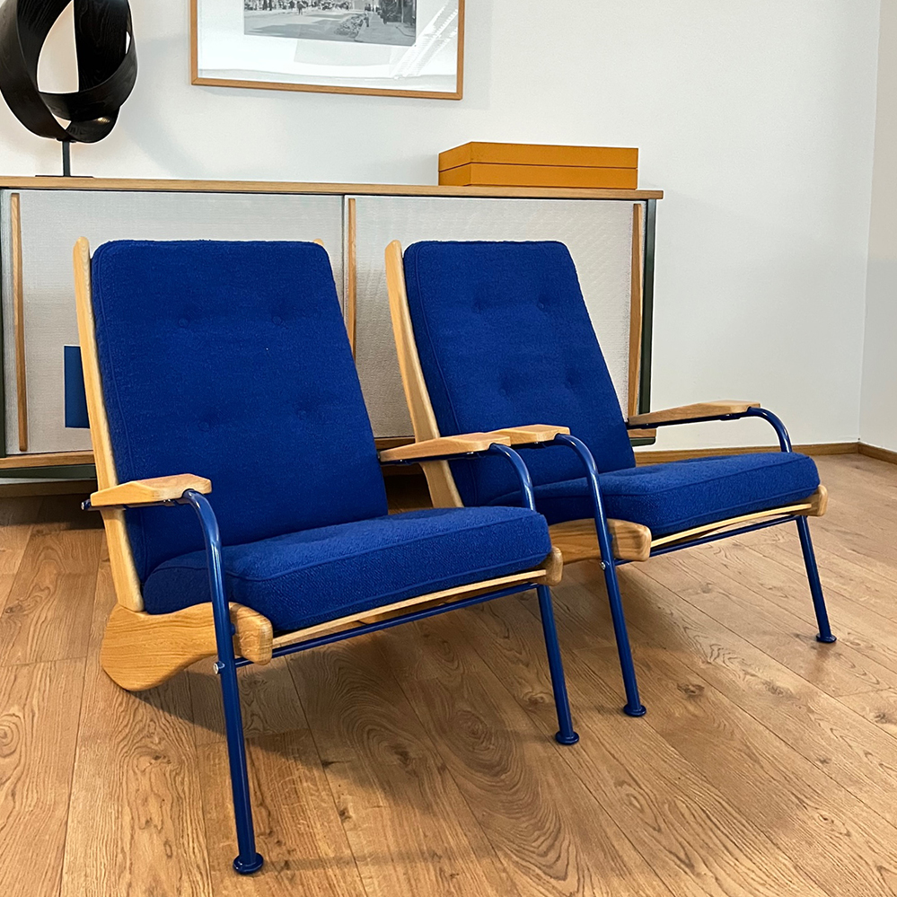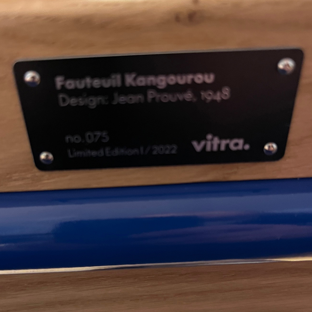 2022 legte Vitra den Fauteuil Kangourou von Jean Prouvé aus dem Jahr 1948 zur Art Basel in einer limitierten Edition von 150 Exemplaren auf, die innerhalb von einer Stunde vergriffen war. Aus einer Kundenkommission bieten wir ein Exemplar der Edition an.