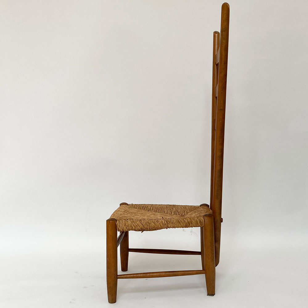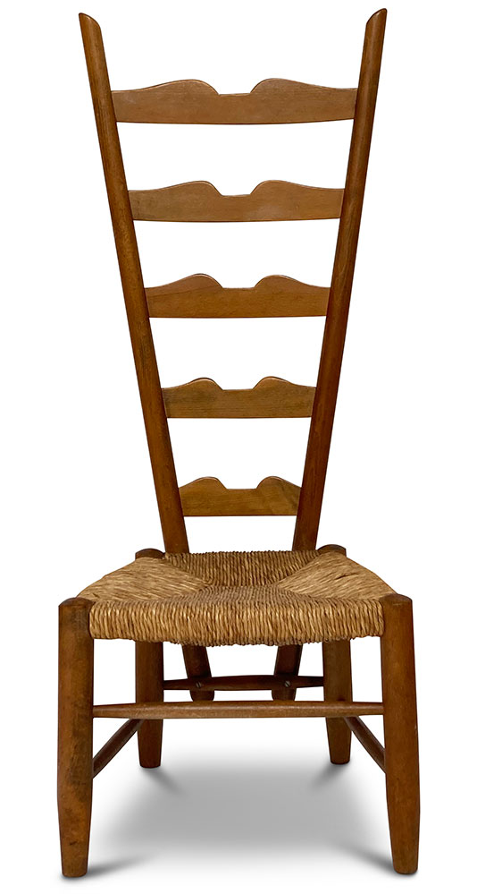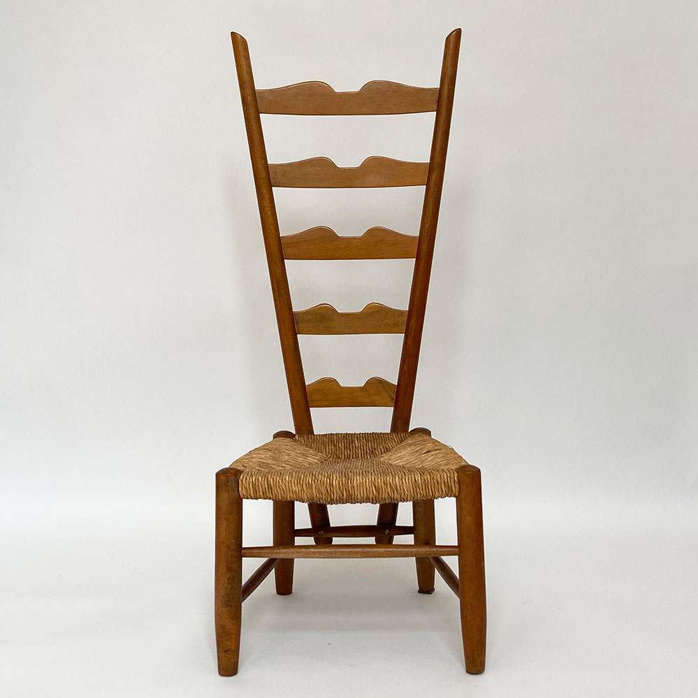 Der Fireside Chair von Gio Ponti ist ein früher Entwurf aus dem Jahr 1939. Der rustikale Sessel besticht durch die 104 cm hohe Rückenlehne, die Sitzhöhe beträgt dabei nur 30 cm (der Sessel ist nicht sehr bequem und eher als Objekt gedacht). Ein Exemplare erhält.