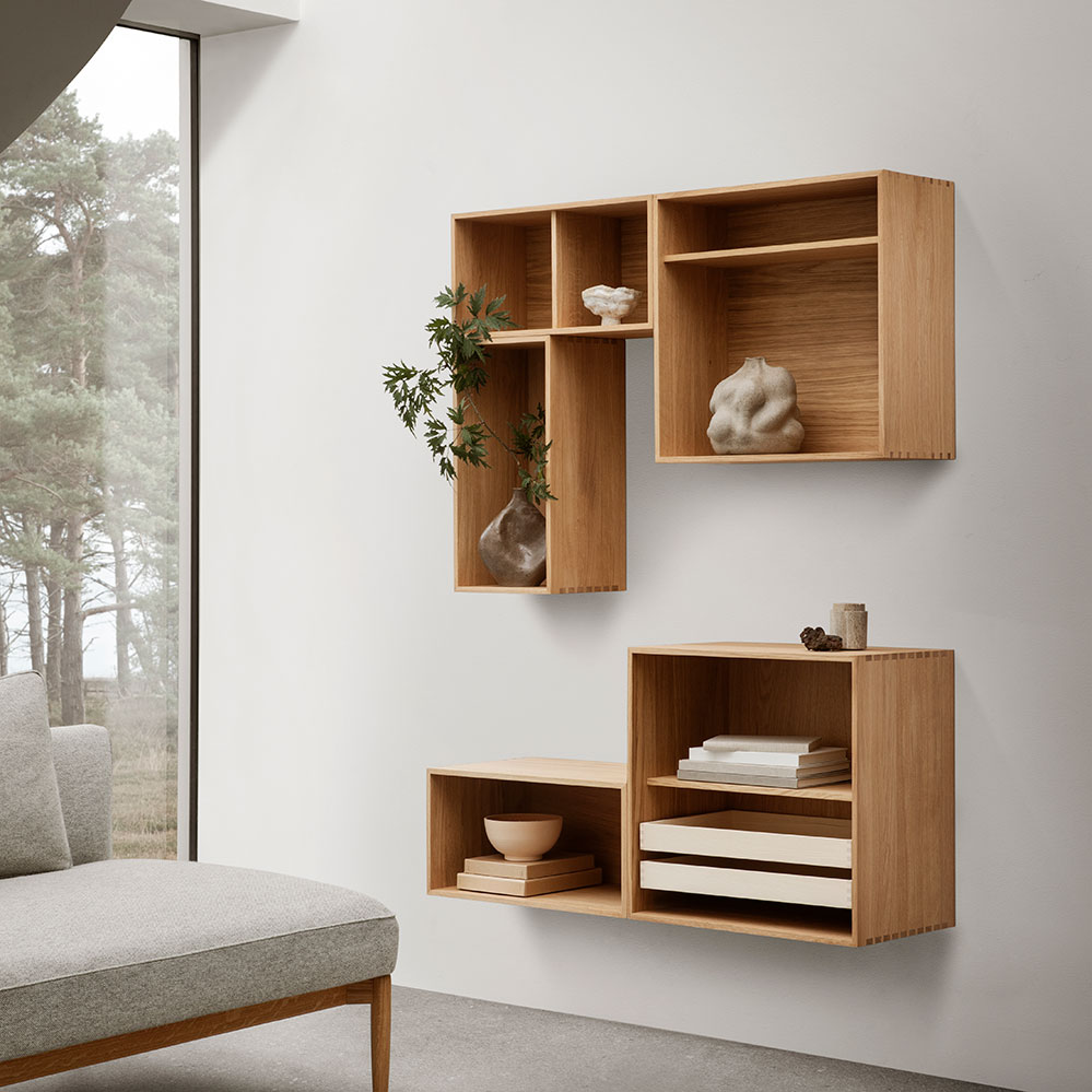 Das Möbelsystem FK63 wurde 1963 von Preben Fabricius und Jørgen Kastholm entworfen und ab 2021 von Carl Hansen neu aufgelegt. Gedacht ist es, verschiedene Kastenelemente miteinander zu kombinieren (siehe auch exemplarische pdf Datei). Dabei sind die unteren Sideboardelemente in der Regel 36 cm, die oberen Elemente (die wahlweise auf die unteren Elemente gestellt werden können oder an der Wand montiert werden 26,5 cm tief). Bitte fragen Sie uns nach Ihrer individuellen Konfiguration, wir beraten Sie gerne!
