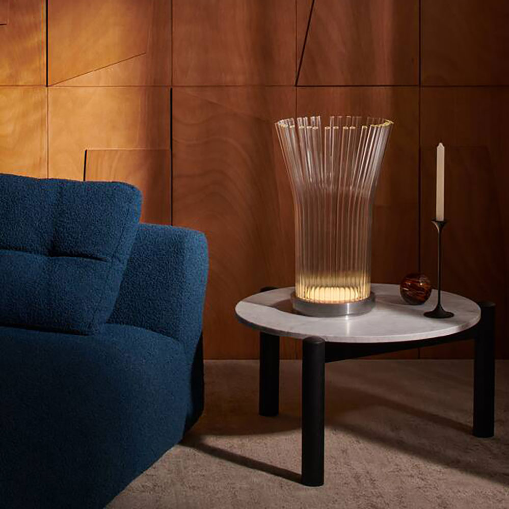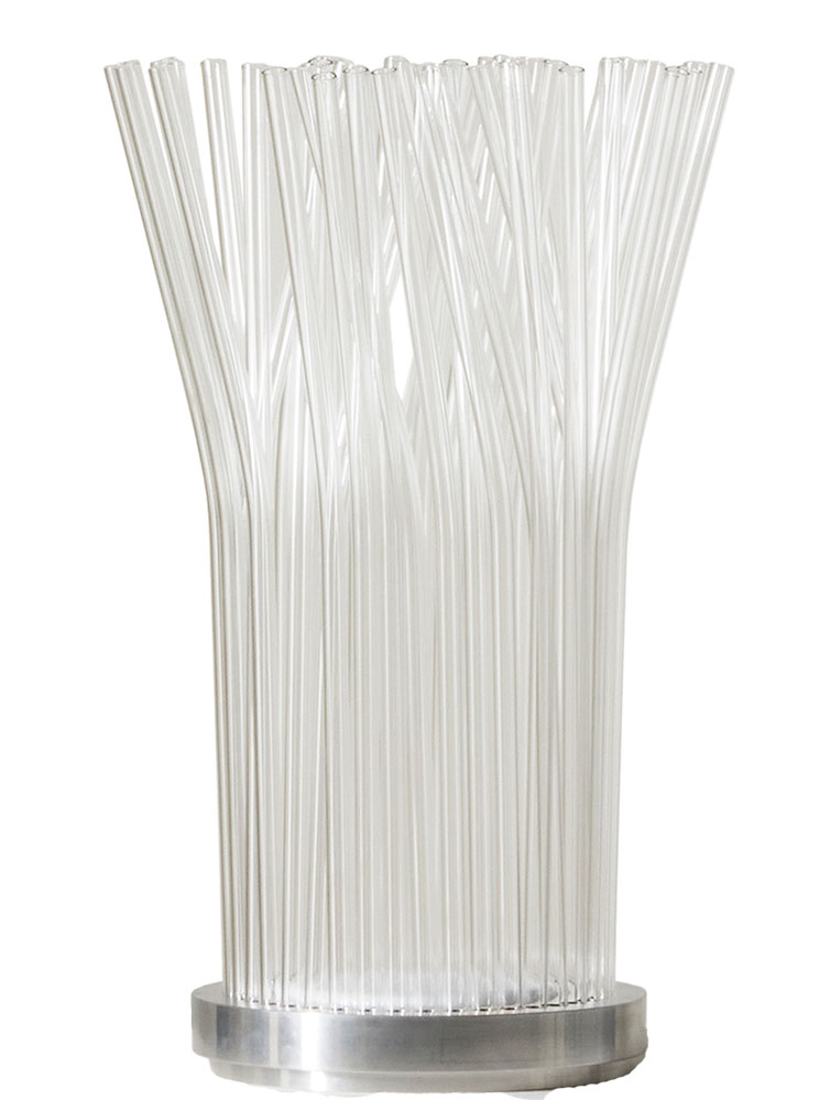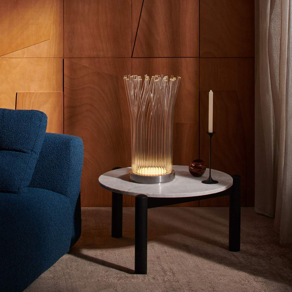 Die Tischleuchte Fluxus-E basiert auf einem Konzept, das der Künstler Paolo Ulian ursprünglich 2001 für eine Ausstellung über die Erfindungen des Industriellen Baron Marcel Bich entwickelte. Die beweglichen Arme, inspiriert von transparenten Plastikröhrchen, erinnern an den Kugelschreiber – Bichs wohl bekannteste Innovation, die später unter dem Markennamen BIC weltweit bekannt wurde. Cassina hat dieses Konzept nun in einer modernen Interpretation als Tisch- und Stehleuchte umgesetzt: Ein zentrales LED-Modul beleuchtet sowohl den Leuchtenkörper als auch den Außenbereich, während kleine LED-Strahler die einzelnen Röhren anstrahlen und so ein warmes, stimmungsvolles Licht erzeugen.