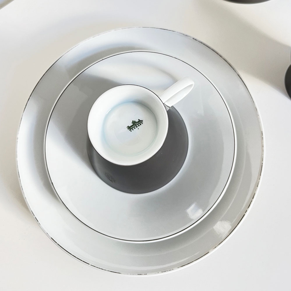 Zwischen 1952 und 1954 entwarf der amerikanische Industriedesigner Raymond Loewy zusammen mit Richard Latham das Service Form 2000. Die hier angebotene Variante aus weiß-grauem Porzellan stammt aus der Rosenthal Herstellung der 1960er Jahre. Insgesamt war Form 2000 das am meist verkaufte Rosenthal Service der 1950er Jahre, bis 1978 wurden annähernd 200 Dekore angeboten.