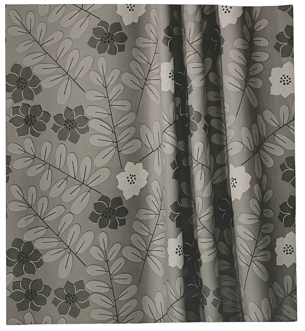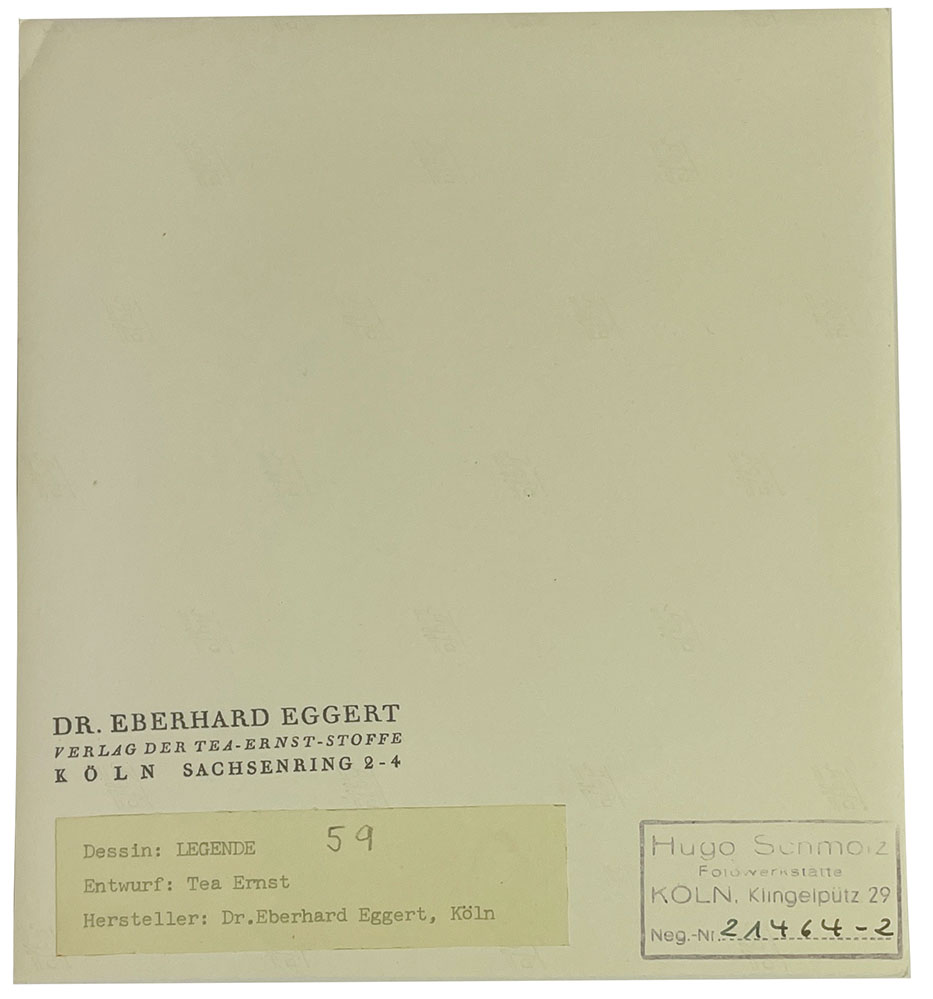 Das Werbefoto „Legende" von Karl Hugo Schmölz aus dem Jahr 1959 stammt aus dem Nachlass der Texilkünstlerin Tea Ernst, dass Motiv zeigt einen ihrer Stoffentwürfe aus den späten 1950er Jahren. Das Archiv der Kölner Künstlerin ging in den Besitz von Hermann Götting über, einem recht bekannten Kölner Original. Dort erwarb es später der Kölner Designhändler und Vintage-Spezialist Fritz Breckheimer.
