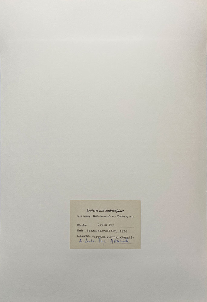 Der Abzug des Fotos vom Original-Negativ entstand Mitte der 1980er Jahre als Edition der „Galerie am Sachsenplatz”, der ehemaligen staatlichen Galerie der DDR in 40 verkäuflichen und 10 nicht für den Handel bestimmten Künstler- bzw. Belegexemplaren. Jede Arbeit wurde dabei vom Künstler oder seinen Angehörigen handschriftlich signiert. Für den 1983 verstorbenen Gyula Pap unterschieb Frau Lenke Haulisch-Pap.