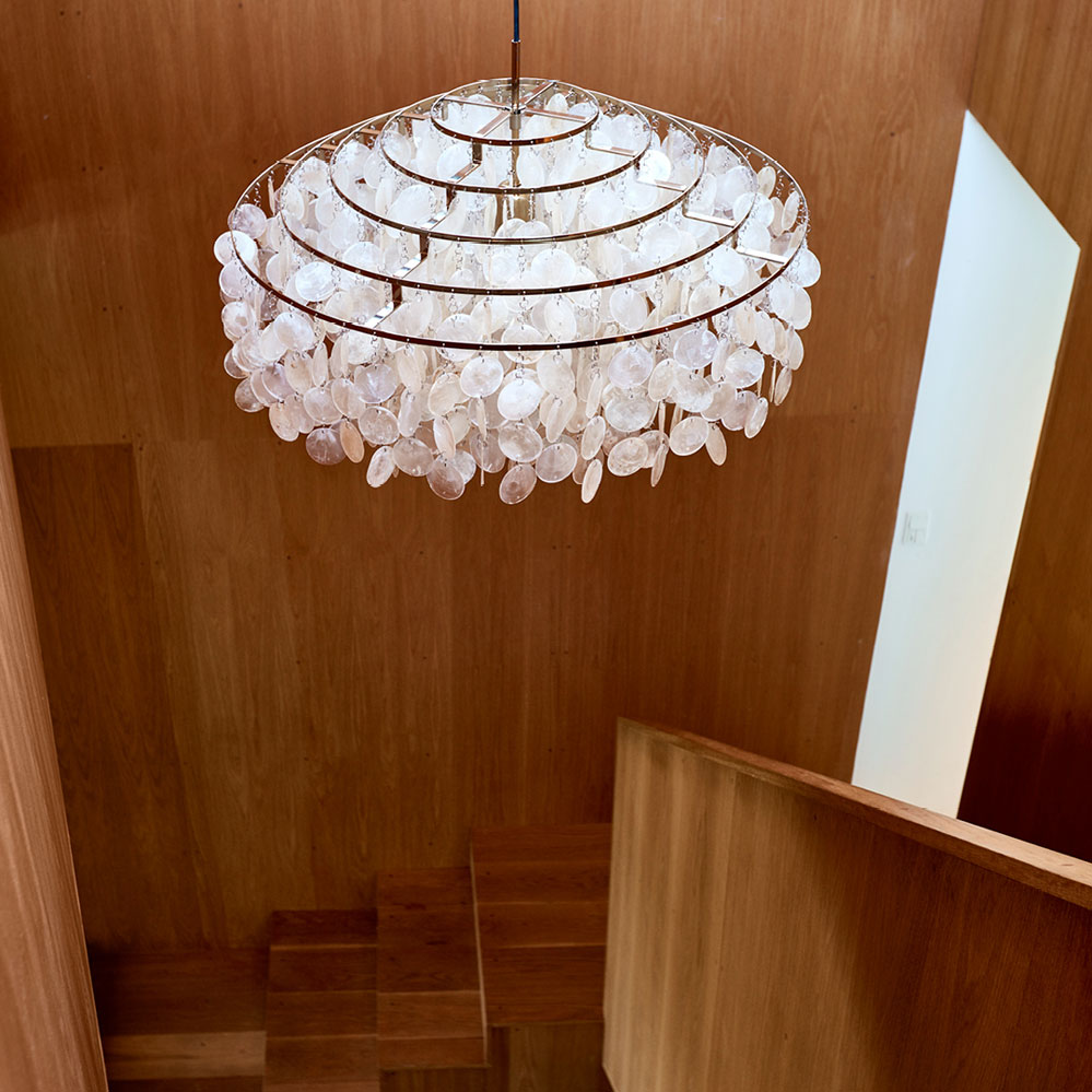 Der Kronleuchter Fun 11DM von Verpan ist ein Entwurf des dänischen Designers Verner Panton aus dem Jahr 1964. Hierbei verteilen sich die Muschelketten über fünf aneinander geordnete Ringe. Erhältlich ist diese Muschelleuchte mit einem Durchmesser von 70 cm wahlweise verchromt oder in Messing.