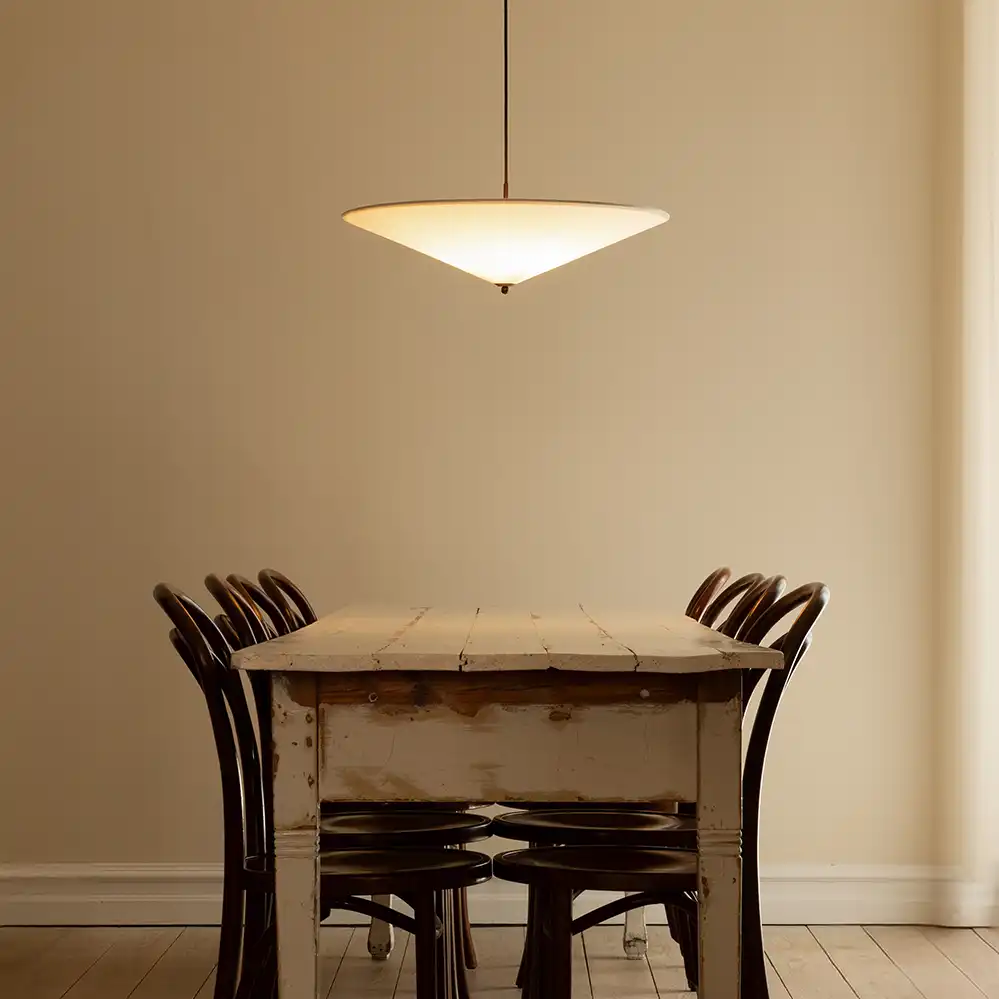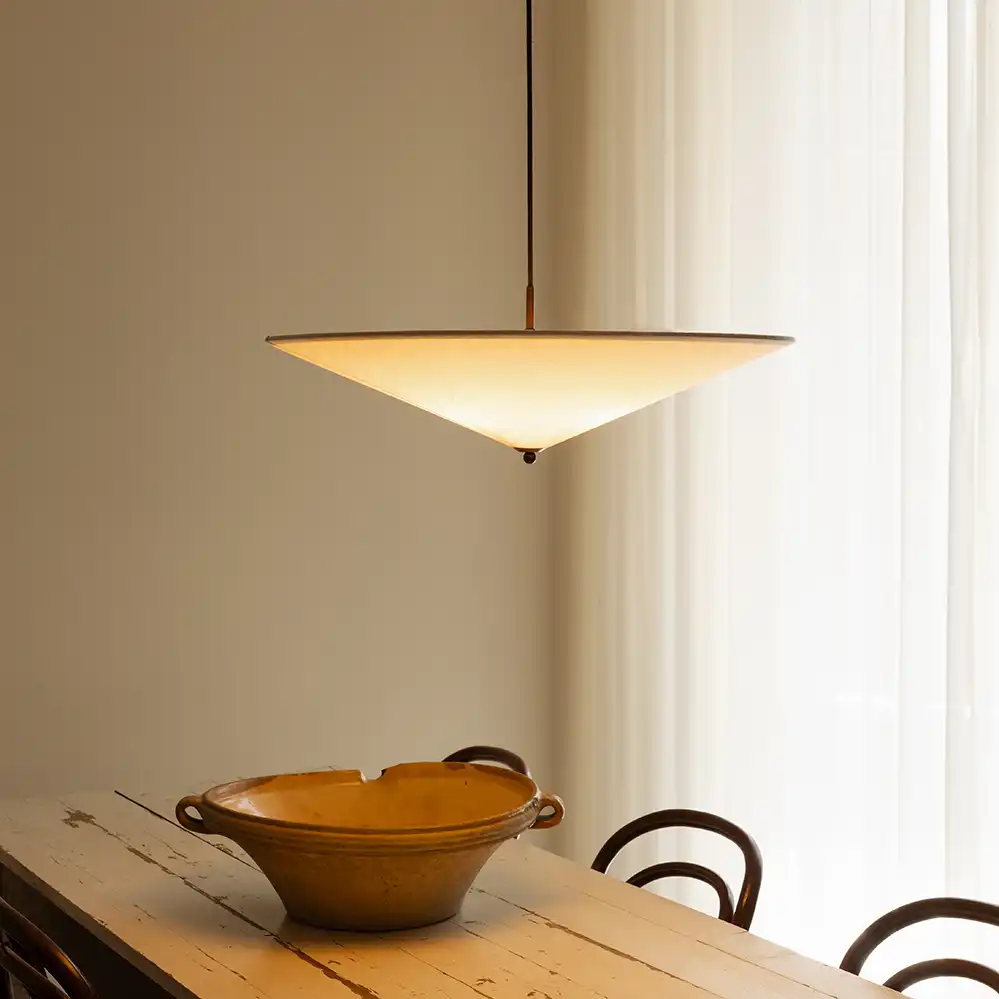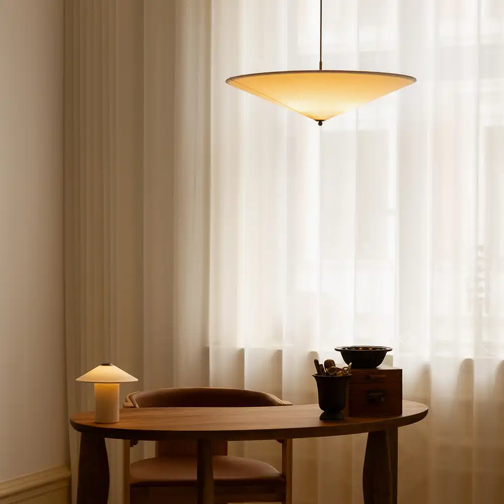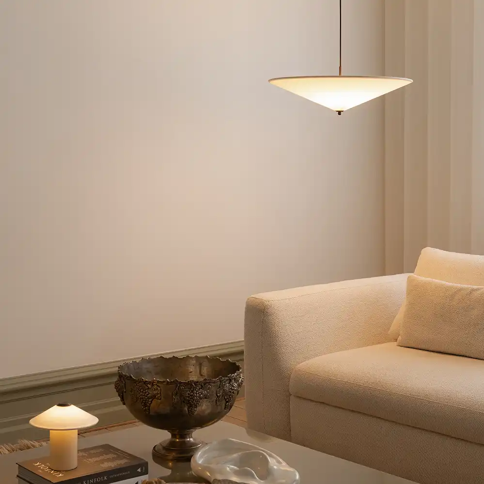 Die Pendelleuchte FUTÉ wurde vom Designstudio GamFratesi entworfen und zeichnet sich durch eine klare Formensprache und den Einsatz hochwertiger Materialien aus. Die Kombination aus Textilschirm, keramischem Sockel und präzise gearbeiteten Metallkomponenten verleiht dem Objekt eine ausgewogene Materialästhetik. Die textile Oberfläche sorgt für eine gleichmäßige Lichtverteilung, die eine angenehme Grundbeleuchtung ermöglicht. Durch ihre funktionale und zurückhaltende Gestaltung eignet sich FUTÉ für verschiedene Einsatzbereiche im Wohn- und Objektbereich.