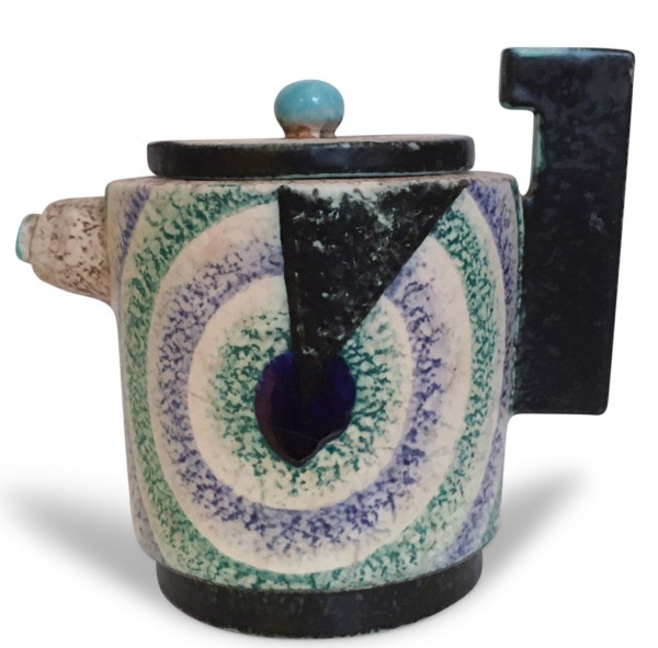 Die seltene Teekanne im Stil des italienischen Futurismus ist ein Entwurf des Bauhauskünstlers Nikolay Diulgheroff. Der Künstler und Maler wurde Bulgarien geboren und studierte in ganz Europa: 1920 und 1921 in Wien, 1922 in Dresden und ab 1923 am Bauhaus in Weimar, wo er ein Anhänger von Johannes Itten wurde. Bereits 1924 hatte er eine eigene Ausstellung in Sofia. 1926 ging Nikolay Diulgheroff nach Turin, um Architektur an der Accademia Albertina zu studieren.