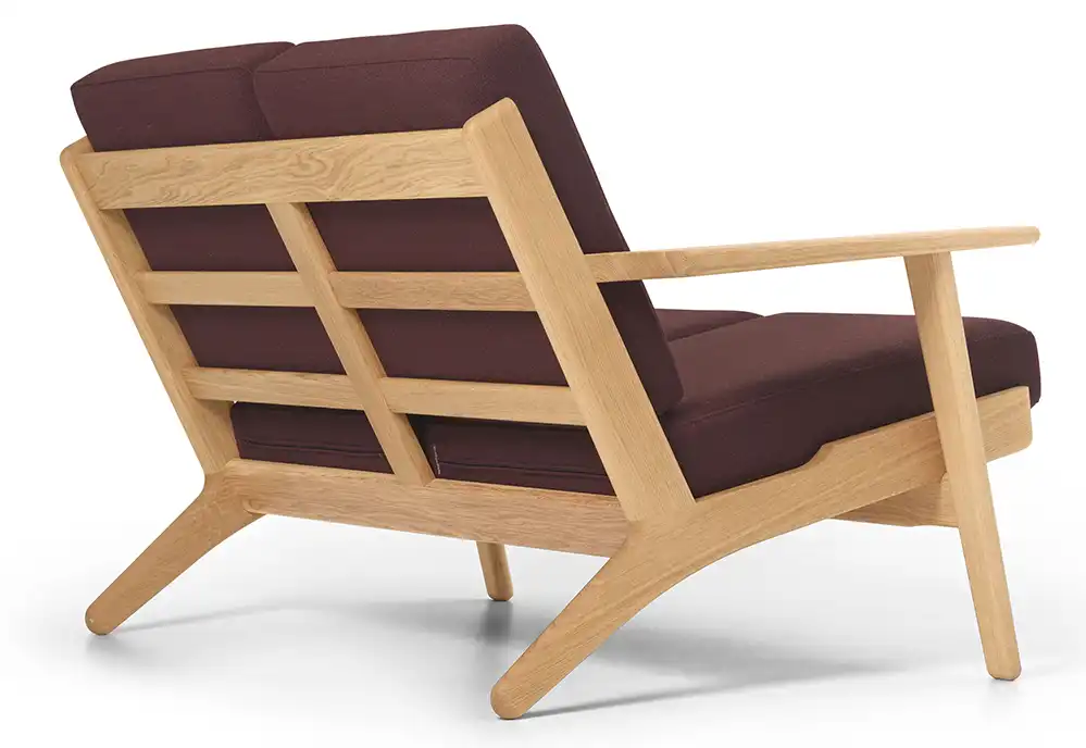 Das GE290 Plank Sofa wurde 1962 von Hans Wegner für Getama entworfen. Passend zum Sofa ist der gleichnamige Sessel mit kurzer und langer Rückenlehne. Charakteristisch bei diesem Design Wegners sind die abgewinkelten Seitenteile sowie die breiten Armlehnen, die hier wohl namensgebend waren. Das Gestell des Sofas ist aus Massivholz gefertigt und setzt sich durch seine eigenständige Formgebung deutlich von den Sitzkissen ab.