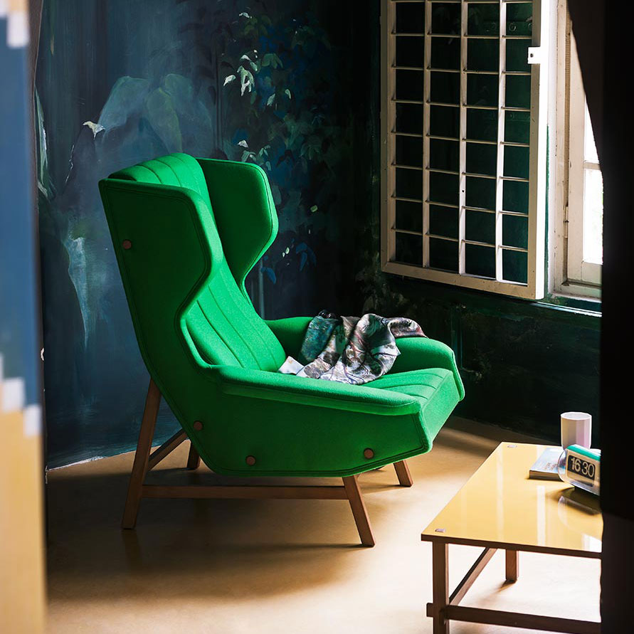 Den Armlehnsessel Giulia entwarf Gianfranco Frattini ursprünglich im Jahr 1957 für Cassina, die Reedition erfolgte 2016 durch Tacchini. In den 1950er Jahren arbeitete Gianfranco Frattini eng mit Cassina zusammen und entwickelte zahlreiche Möbel (u.a. für verschiedene Passagierschiffe). Ein passender Fußhocker für den bequemen Ohrensessel ist zusätzlich bei Tacchini erhältlich.