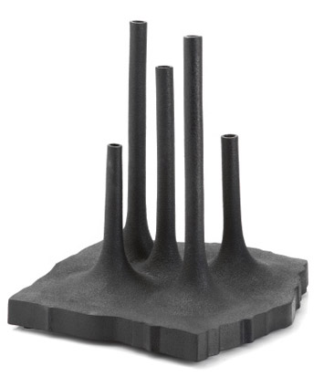 Die fünfhalsige Green Line Vase ist die größte Vase der 2005 für Bitossi entworfenen Serie. Der Name irritiert - denn alle vier Modelle der Serie bestehen aus schwarzer Keramik, wobei die Bodenplatte abnehmbar ist. Gedacht ist es, verschiedene Vasen der Serie miteinander zu kombinieren. Durch den strukurierten Rand entsteht dabei ein Muster, welches entfernt an Erdbebenspalten erinnert.