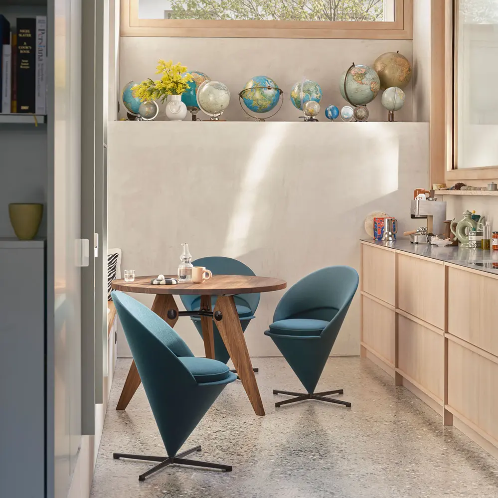 Jean Prouvés Möbelentwürfe entstanden in der Zeit von 1924 bis 1956 und waren in ihrer Funktionalität am Bedarf der Zeit ausgerichtet – einfach, langlebig und preiswert. Gefertigt wurden sie damals meist in Kleinauflagen in seiner eigenen Manufaktur (Les Ateliers Jean Prouvé), der Vertrieb erfolgte über die Pariser Galerie Steph Simon. Im Gegensatz zu den Entwerfern am Bauhaus, die häufig mit Stahlrohr experimentierten, arbeitete Prouve primär mit umgeformtem Stahlblech. Seine aus der Automobil- und Flugzeugindustrie gewonnenen Fertigungskenntnisse prägten dabei formale Details ebenso wie die Gesamterscheinung. Zusammengeschraubtes und Montiertes sind Ausdruck seines konstruktiven Entwurfsprinzips.