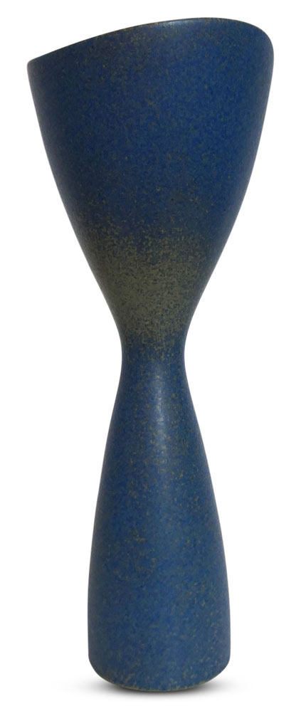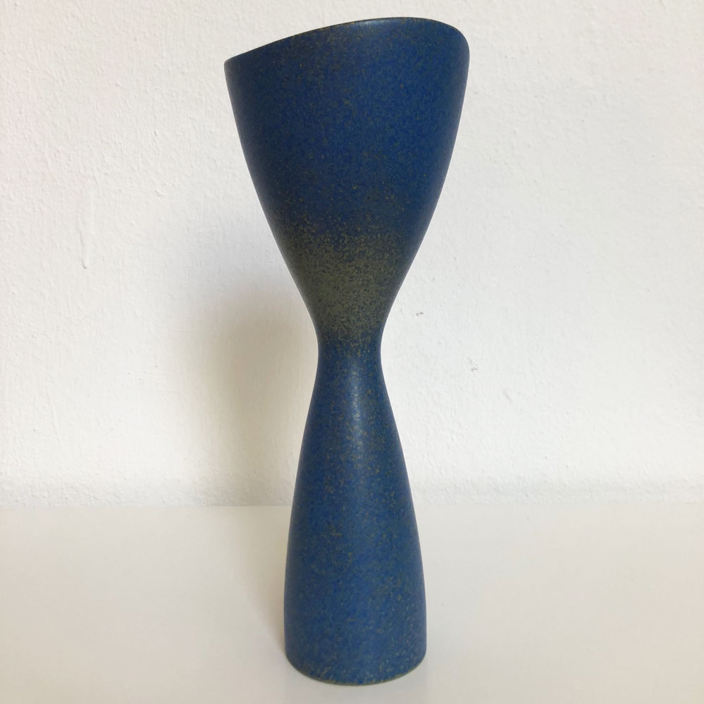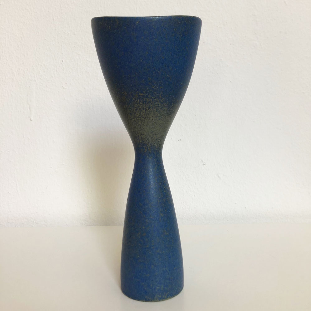 Die organische Vase mit blau-brauner Glasur entwarf der schwedische Keramiker und Glaskünstler Stig Lindberg als Art Director für Gustavsberg in den 1950er Jahren.