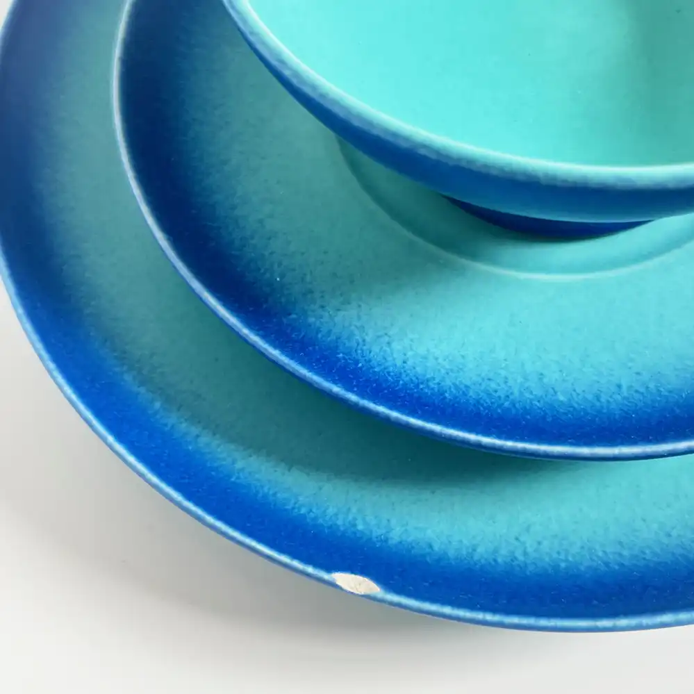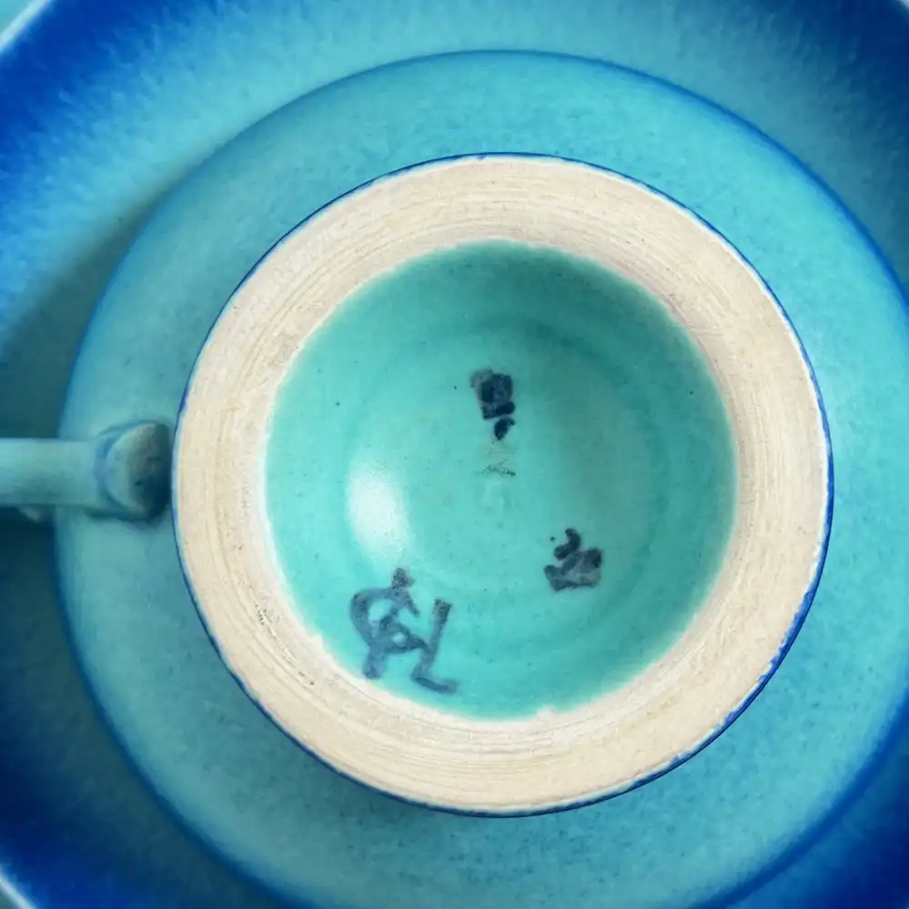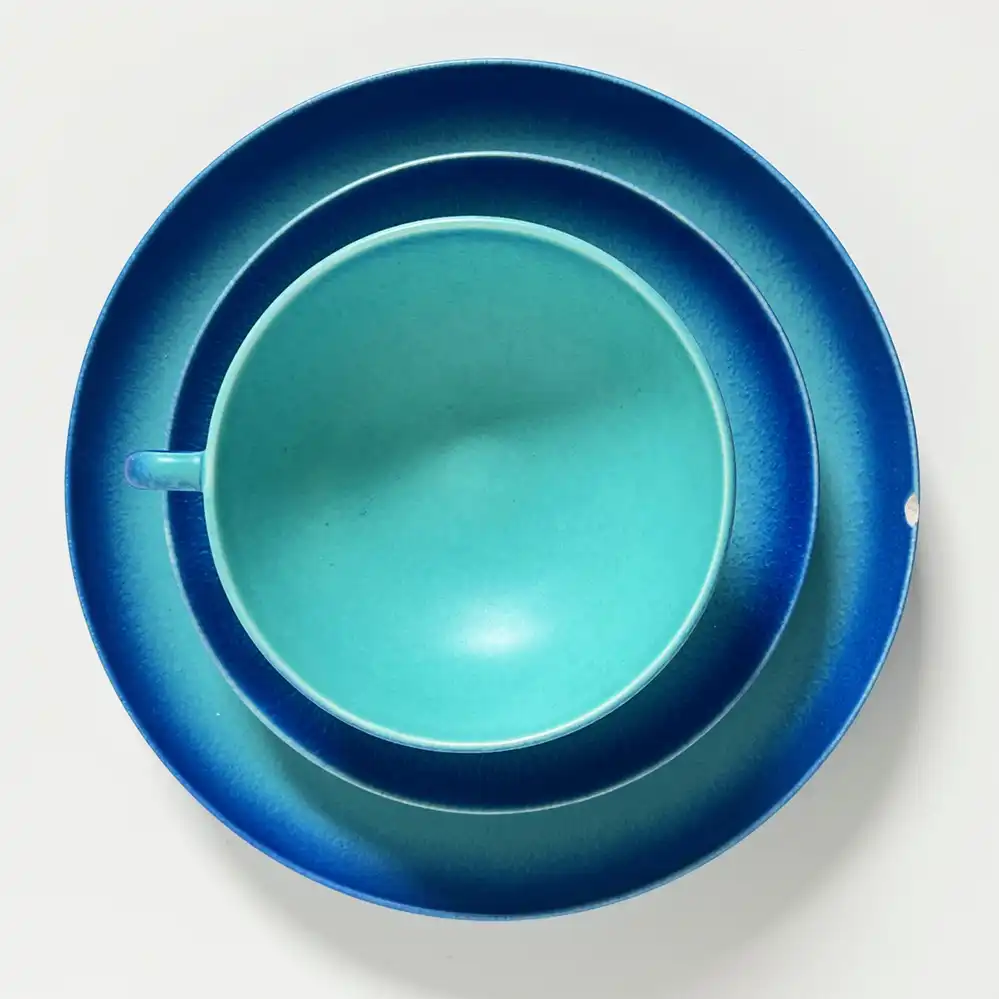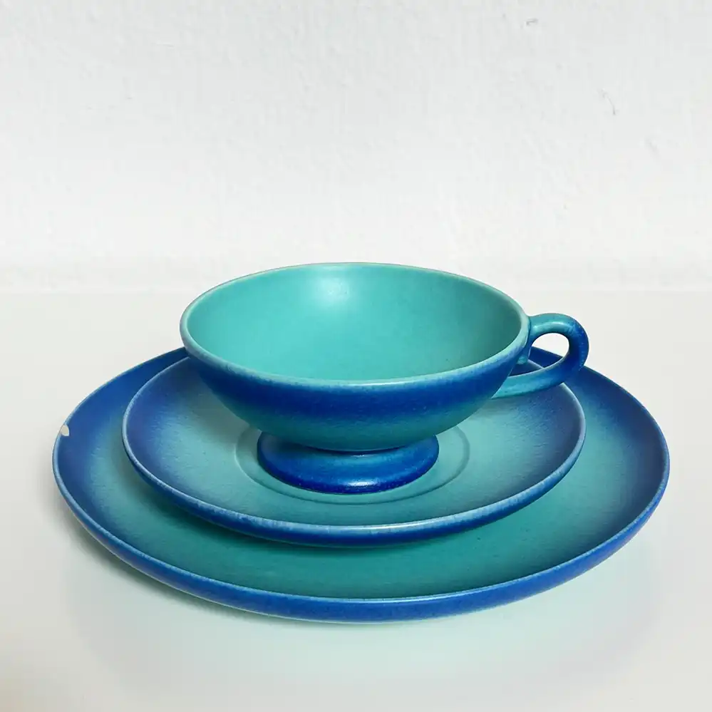 Das dreiteilige Teegedeck wurde um 1930 von Margarete Heymann-Loebenstein entworfen und gehört zu dem Teeservice 216. Das Gedeck überzeugt vor allem durch das Spritzdekor mit einem Verlauf von Blau bis Türkis.