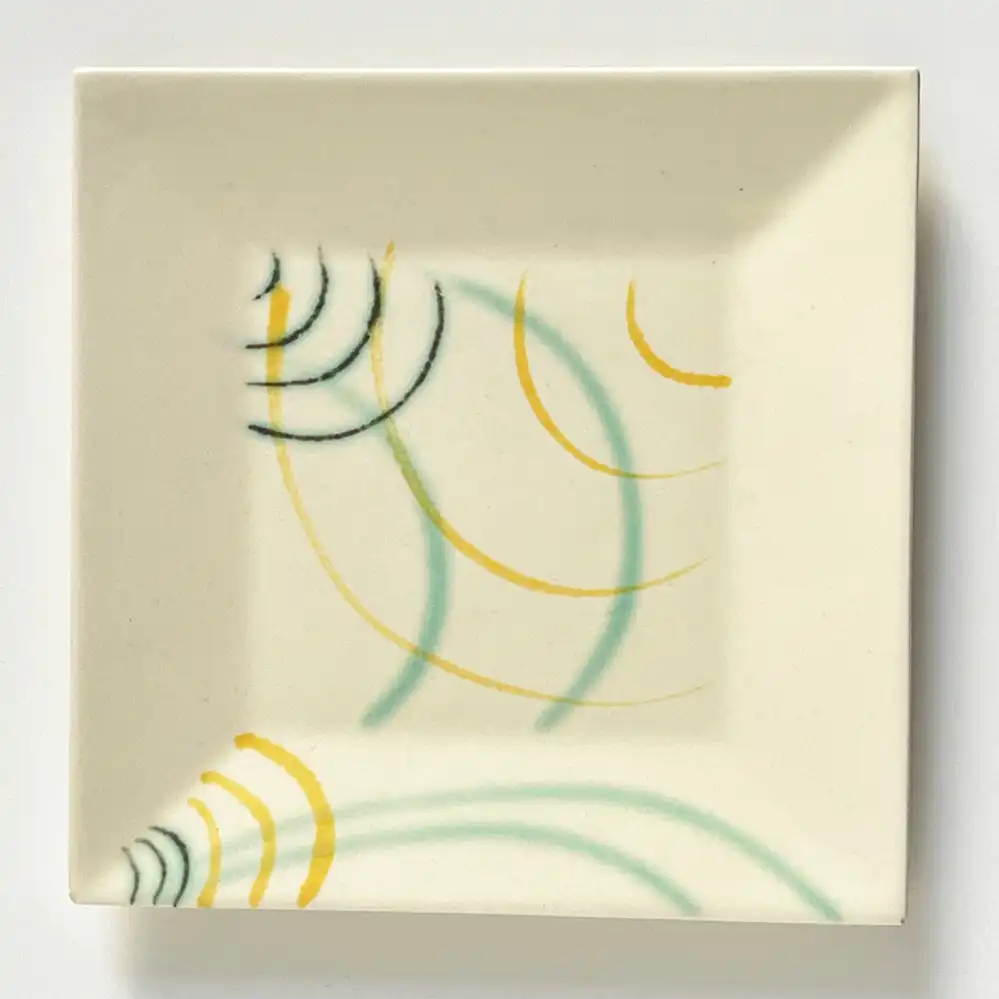 Der quadratische Teller erinnert durch Form und Größe an Gastromiebedarf der 1980er Jahre, stammt aber aus den 1920er und ist ein Entwurf von Margarete Heymann-Loebenstein-