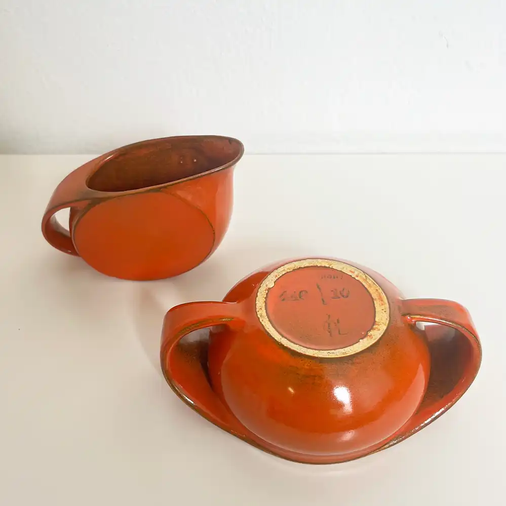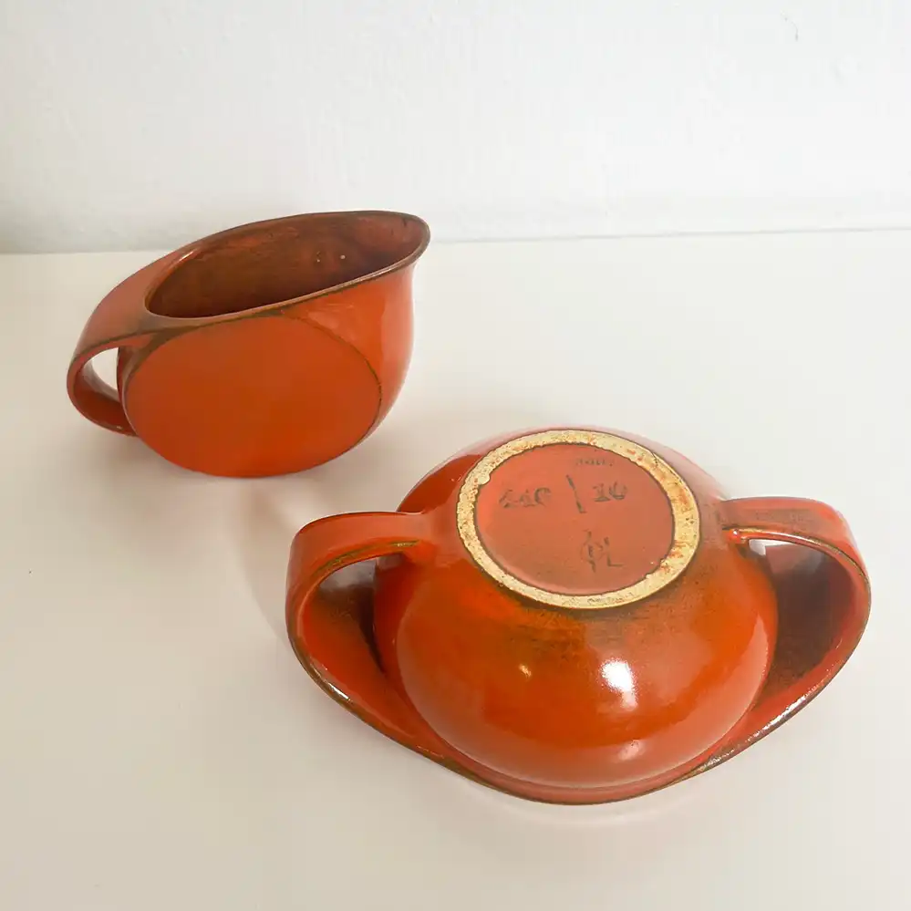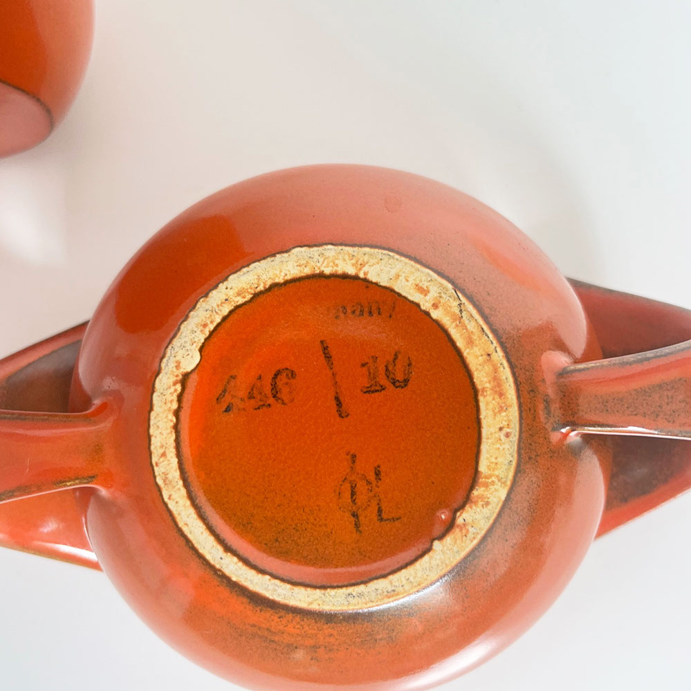 Als Glasur wurde eine rote Uranglasur verwendet, daher wird das Gedeck hier ausdrücklich als Sammlerexemplar für Museen oder Sammler angeboten, eine tägliche Nutzung wird wegen der minimalen Radioaktivität nicht empfohlen.
