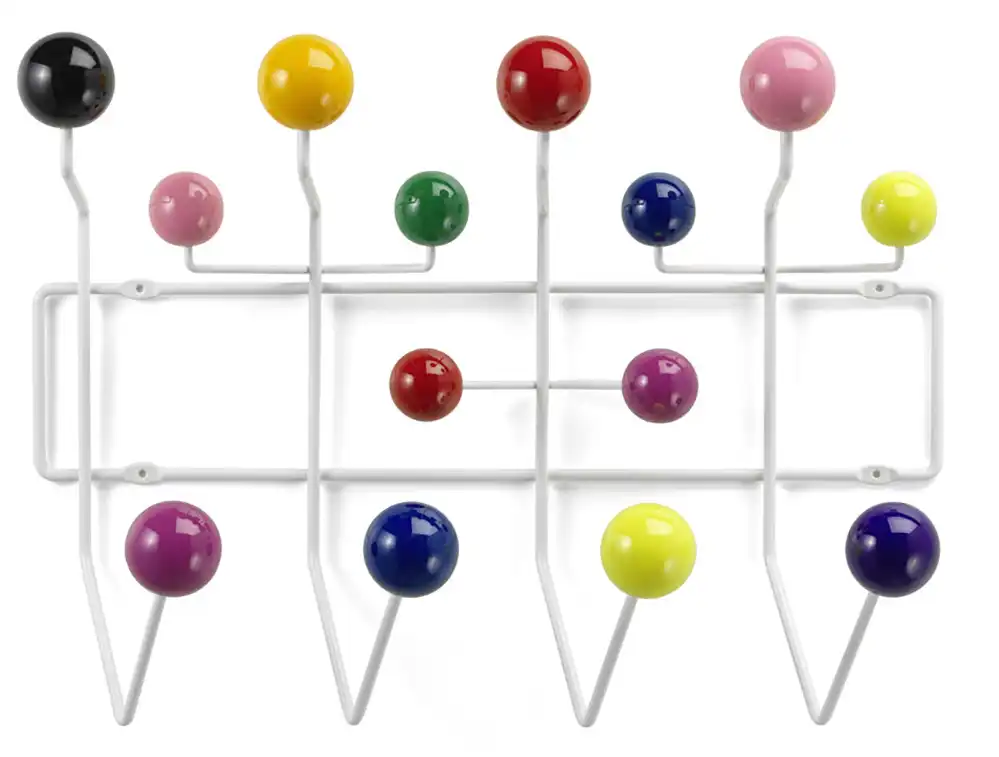 Die berühmte Garderobe Hang it all von Charles Eames ist eine fröhliche Alternative zum gewöhnlichen Kleiderhaken. Der Name drückt bereits aus, was das Eames Ehepaar (die ursprüngliche Farbgebung basiert auf einem Farbkonzept von Ray Eames) mit diesem Entwurf von 1953 bezwecken wollte – die bunten Holzkugeln der Hang it all sollte Kinder ermuntern, ihre Kleidung daran aufzuhängen.