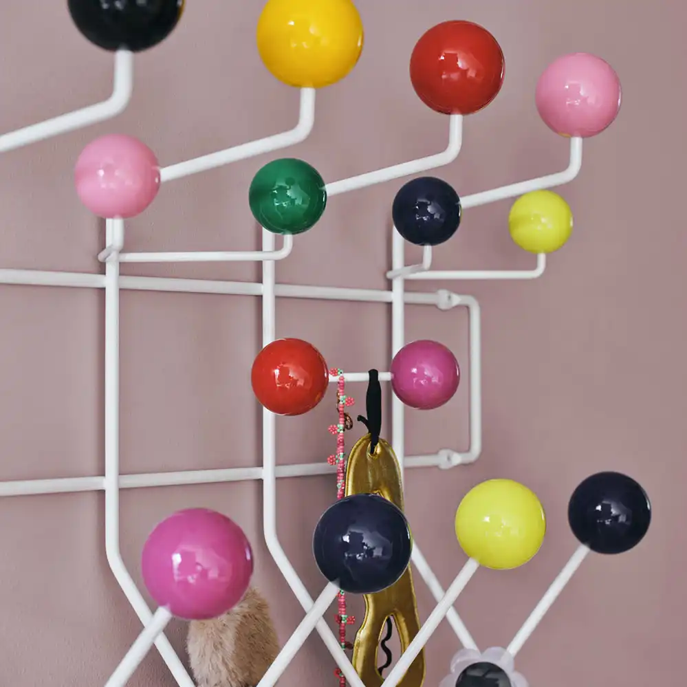 Heute wird die Garderobe mit dem filigranen Drahtgestell und den farbig lackierten Holzkugeln nicht nur im Kinderzimmer genutzt, sondern erfreut sich in vielen Hausfluren großer Beliebtheit. Denn die Maße wurden von Charles Eames bewusst so bestimmt, dass die Garderobe auch an Türen befestigt werden kann oder das mehrere Hang it All nebeneinander positioniert werden können, denn der Abstand der Kugeln ist immer gleich.
