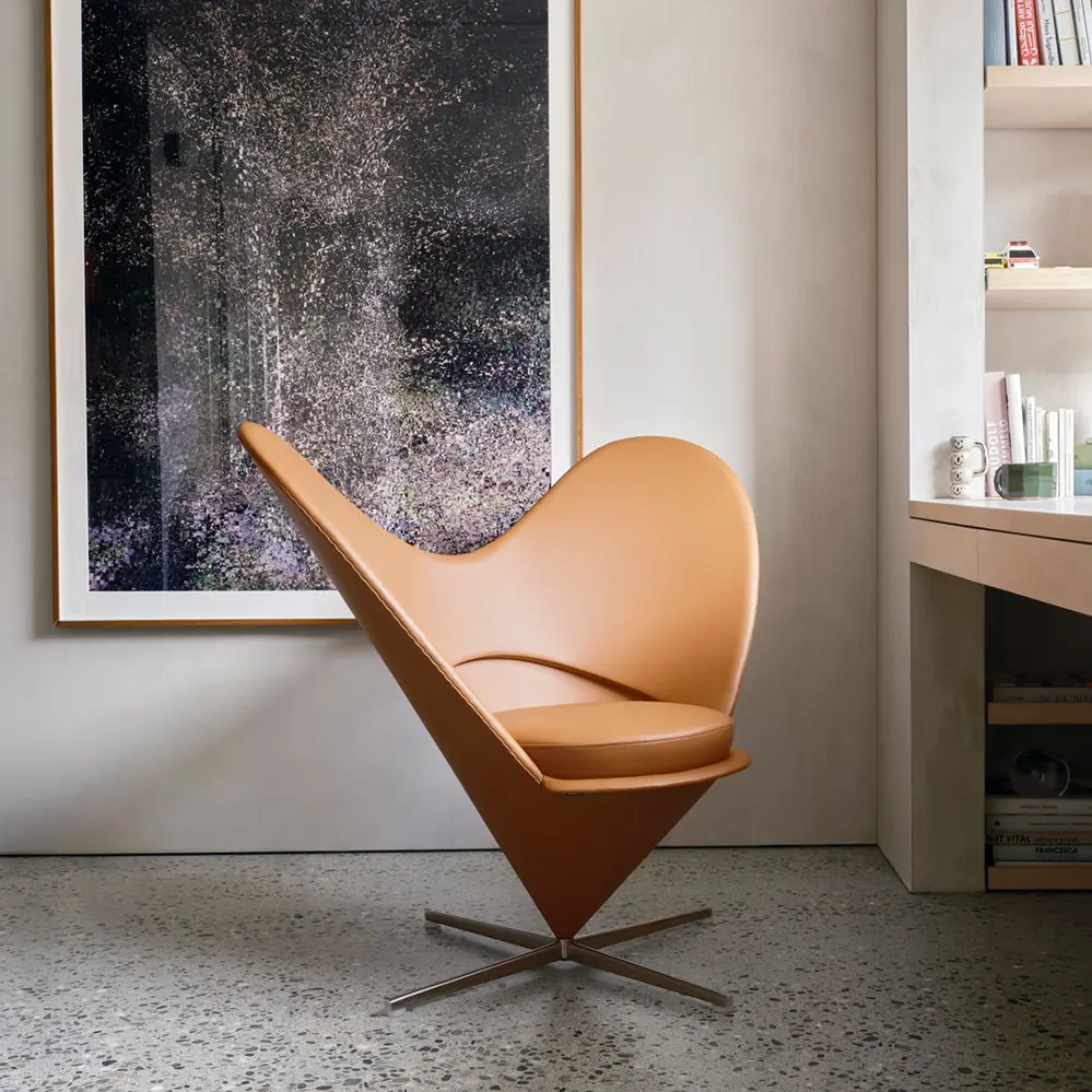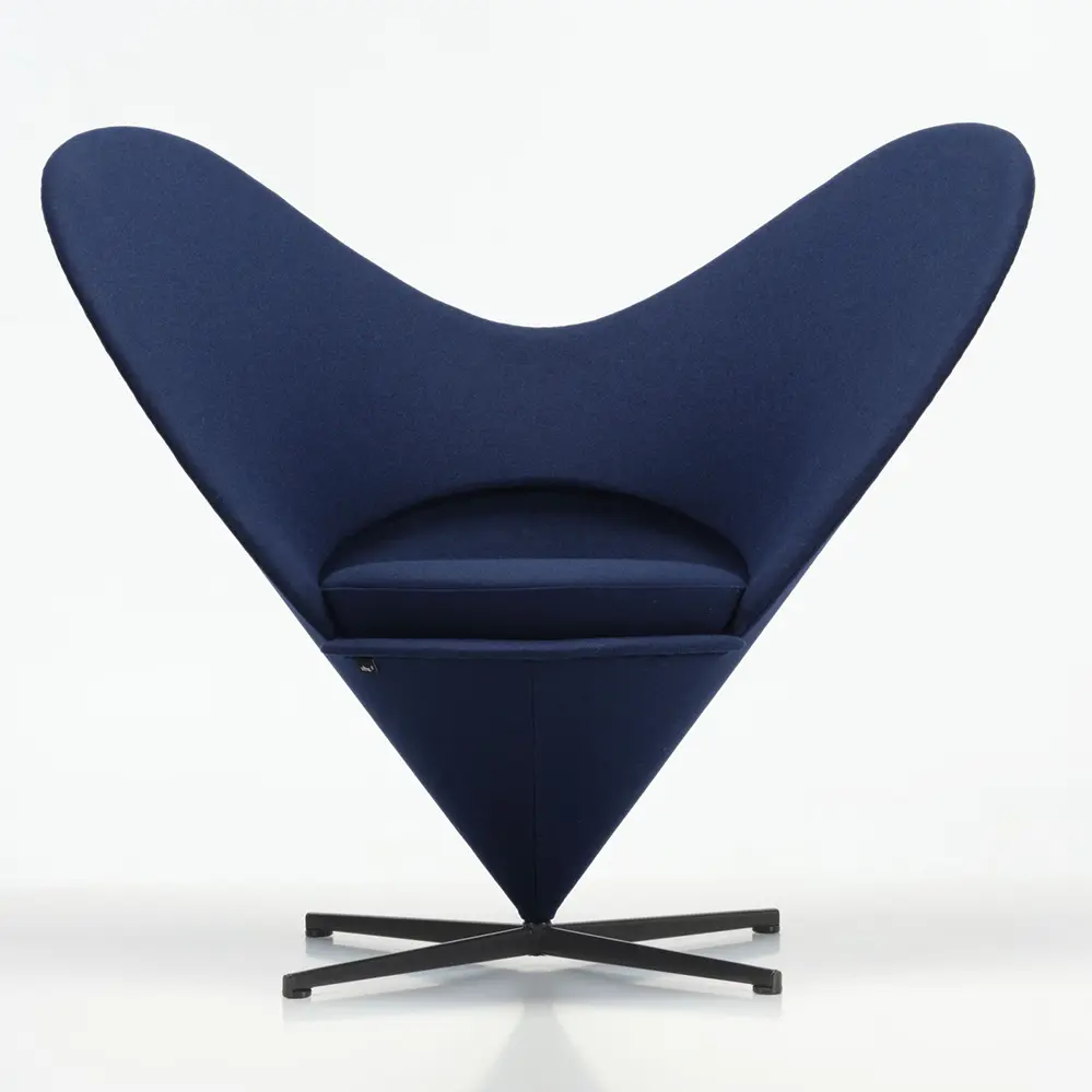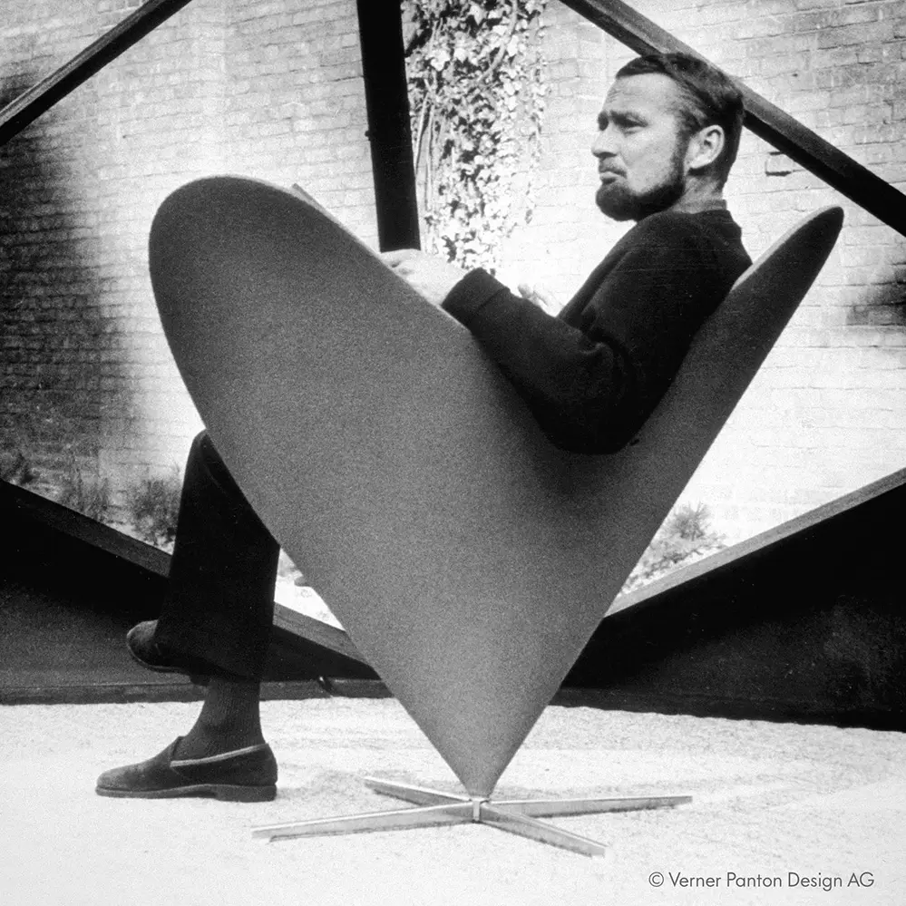 Mit dem Entwurf des Heart Cone Chair entwickelt Verner Panton die Idee seines berühmten Eistütensessels zu einer modernen Interpretation eines Ohrensessels weiter. Die besonders extravagante Silhouette erinnert an eine Herzform, die diesem Klassiker auch seinen Namen verleiht. Der für die damalige Zeit sehr futuristische Entwurf beruht auf einer klassischen geometrischen Figur, dem Kegel, der auf einem Untergestell aus Edelstahl drehbar gelagert ist. Ursprünglich wurde der Heart Cone Chair, wie auch der Cone Chair, zuerst von Fritz Hansen, später dann von Plus Linie hergestellt. Die heutige Edition des Eisentütensessels ist bei Vitra zu Hause. Die letzte Abbildung zeigt Verner Panton in seinem ikonischen Entwurf.