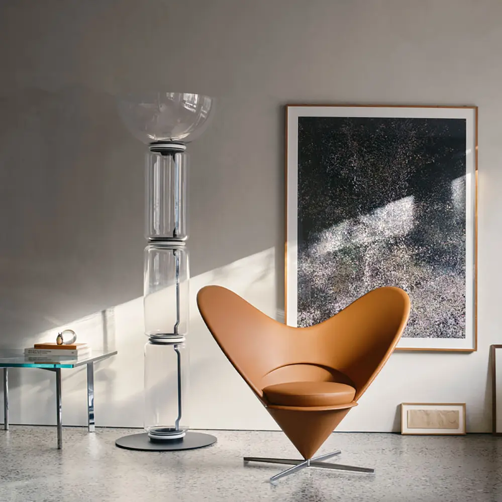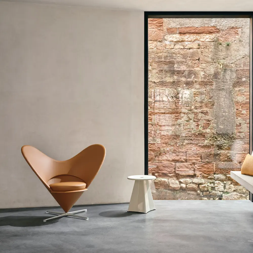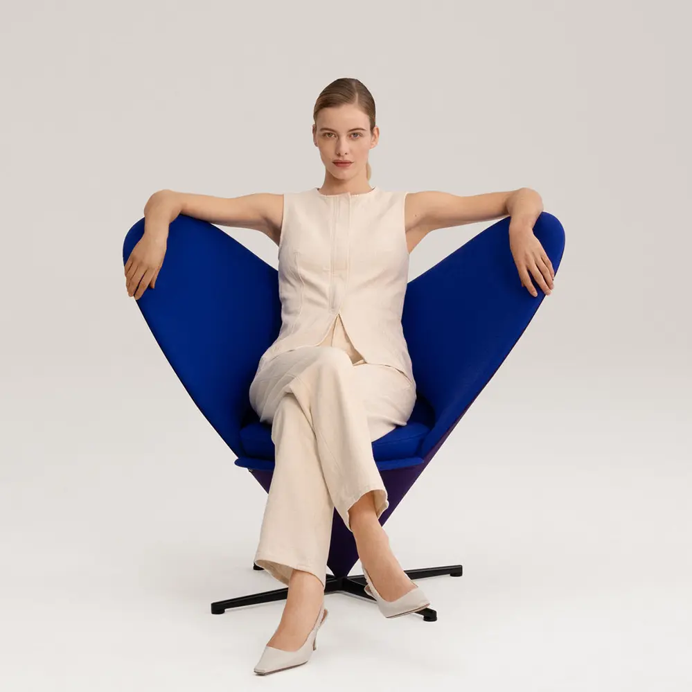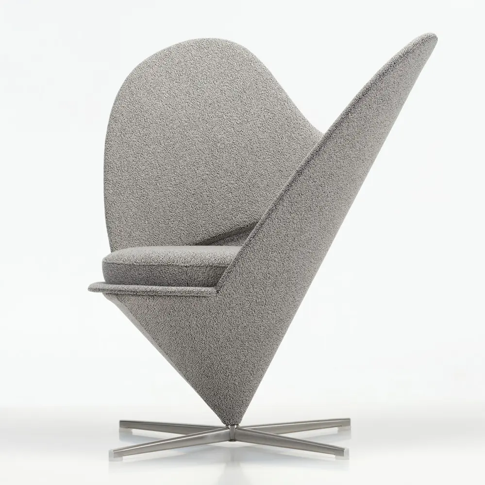 Mit dem Entwurf des Heart Cone Chair entwickelt Verner Panton die Idee seines berühmten Eistütensessels zu einer modernen Interpretation eines Ohrensessels weiter. Die besonders extravagante Silhouette erinnert an eine Herzform, die diesem Klassiker auch seinen Namen verleiht. Der für die damalige Zeit sehr futuristische Entwurf beruht auf einer klassischen geometrischen Figur, dem Kegel, der auf einem Untergestell aus Edelstahl drehbar gelagert ist. Ursprünglich wurde der Heart Cone Chair, wie auch der Cone Chair, zuerst von Fritz Hansen, später dann von Plus Linie hergestellt. Die heutige Edition des Eisentütensessels ist bei Vitra zu Hause. Die letzte Abbildung zeigt Verner Panton in seinem ikonischen Entwurf.