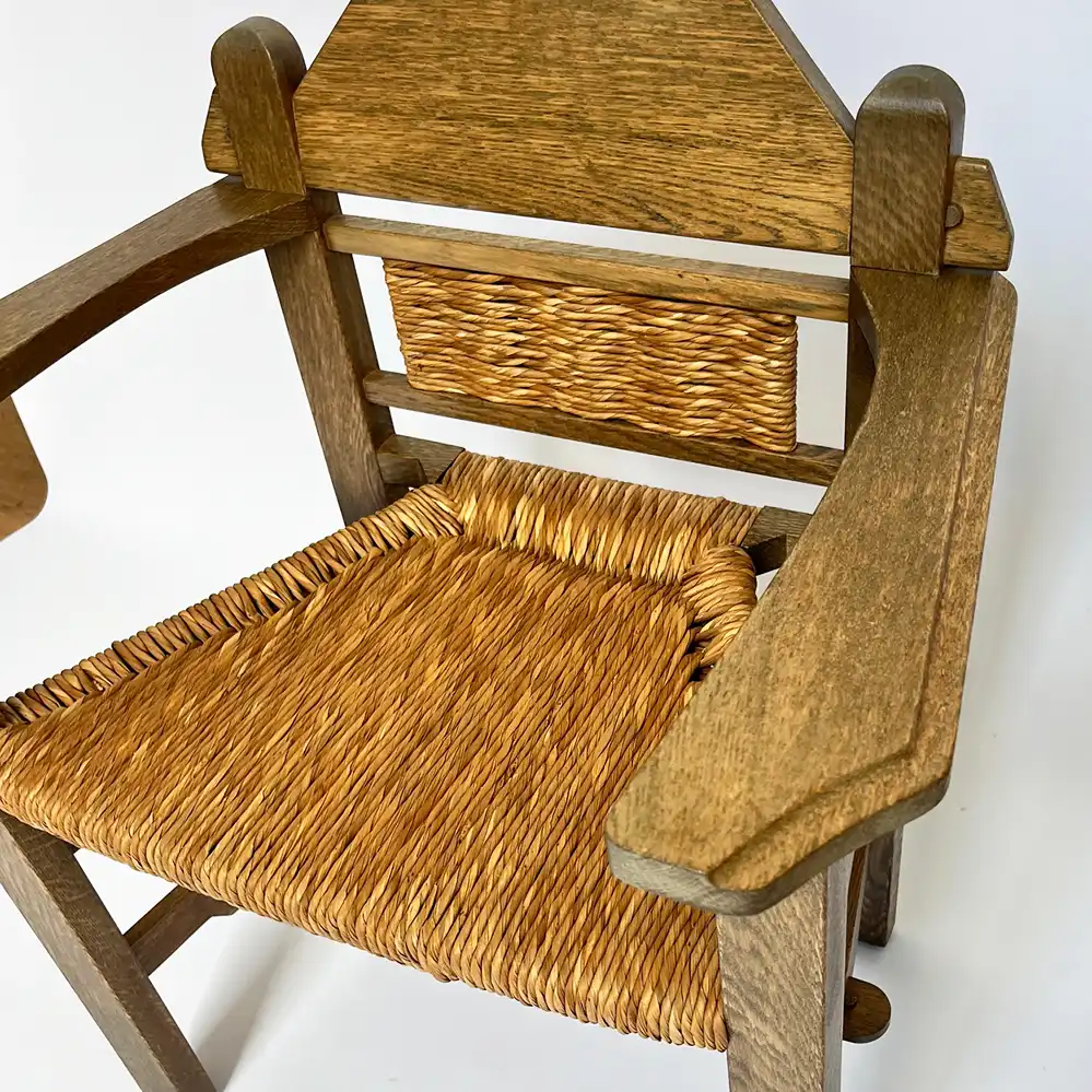 Der expressionistische Armlehnstuhl ist ein Entwurf des Bildhausers Bernhard Hoetger und wurde von ihm wohl auch bei seinem Hauptwerk, der Böttcherstraße in Bremen verwendet. Dort wurde die Gaststätte „Zu den 7.Faulen” mit diesem Stuhltyp ausgestattet. Der hier angebotene Stuhl ist kein Original seiner Zeit, sondern stammt wohl aus den 1970er oder 80er Jahren.