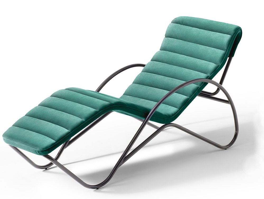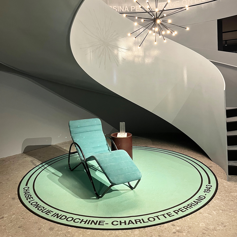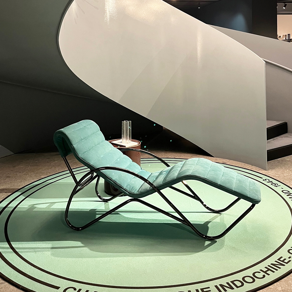 Die Indochine Chaise Longue entwarf Charlotte Perriand während ihres kriegsbedingten Asien-Aufenthalts im Jahr 1943 als Ruheliege während ihrer Schwangerschaft. Denn in den letzten Monaten ihrer Schwangerschaft war sie aus medizinischen Gründen gezwungen war, im Bett zu bleiben, und entwickelte daher eine Chaiselongue mit Armlehnen, die es ihr ermöglichte, weiterhin zu lesen, zu schreiben und zu entwerfen. Da es während des Pazifikkriegs unmöglich war, Chromrohre zu beschaffen, wurde das erste Exemplar aus Rattan gefertigt. 2024 wurde der eher unbekannte Entwurf von Cassina aufgelegt, die Ruheliege ist wahlweise in Stoff (wie abgebildet) oder in Leder (wie hier angeboten) erhältlich.