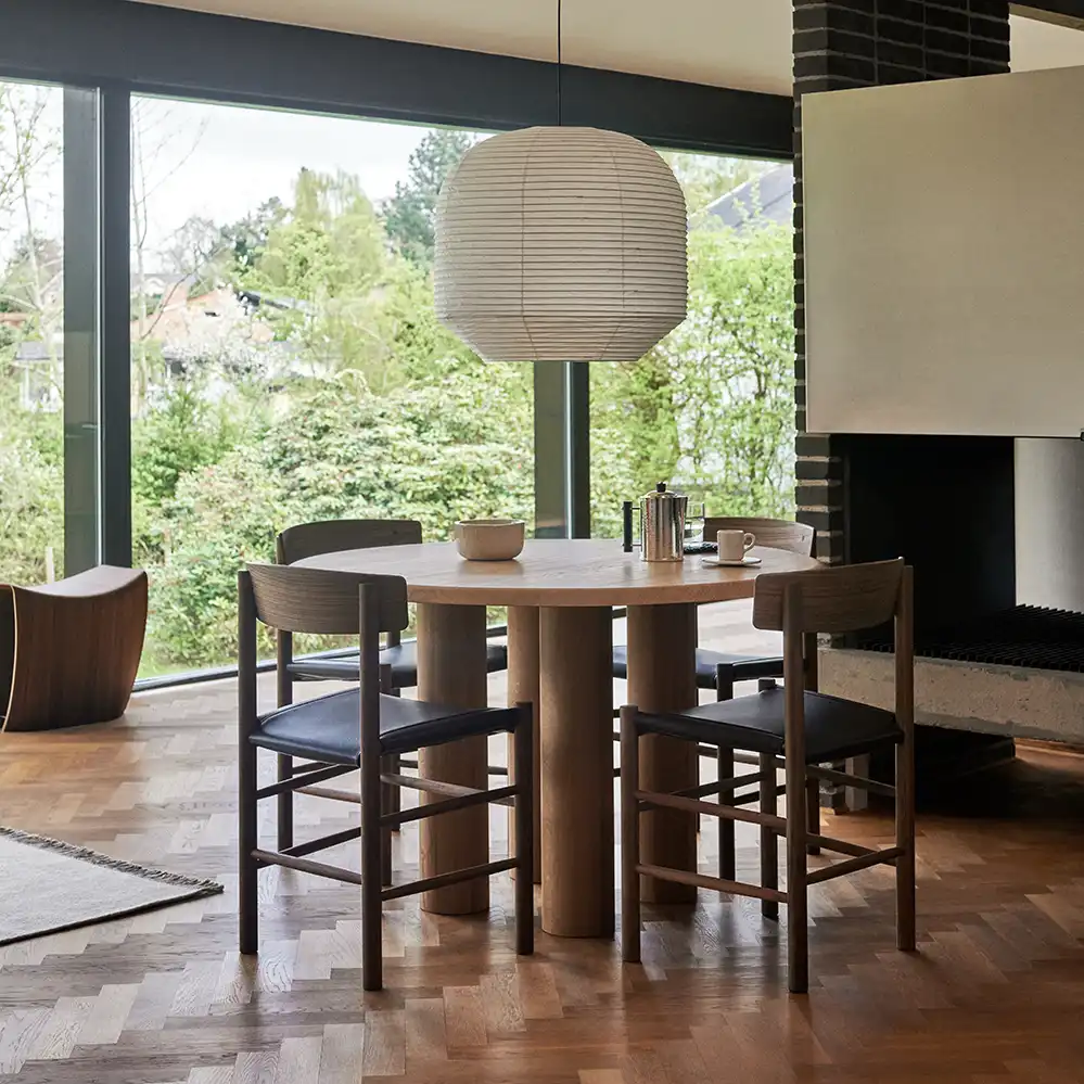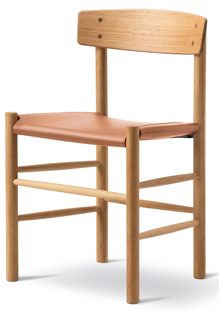 Seit 2025 ist der J39 Stuhl von Fredericia mit einer Sitzfläche in Leder oder Leinen ehältlich. Das Sitzmöbel ist der erfolgreichste Stuhlentwurf von Børge Mogensen, inspiriert sowohl von seinem Lehrmeister Kaare Klint als auch von den amerikanischen Shakermöbeln des 19. Jahrhunderts. Mogensen entwarf diesen klasssischen und sehr robusten Geflechtstuhl im Jahr 1947, als er Leiter der Entwicklungsabteilung beim dänischen FDB Genossenschaftsverband war. Dieser Verband hatte sich das Ziel gesetzt, moderne Möbel zu erschwinglichen Preisen zu vertreiben. Der passende Esstisch zum Stuhl ist das Modell Tisch C18.