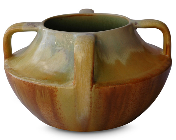 Diese vierhenkelige Vase ist ein Entwurf aus der Keramik- und Modellierklasse der Großherzoglich-Sächsische Kunstgewerbeschule Weimar um 1907. Es ist dabei unklar, ob die Formgebung von dem Leiter der Klasse Henry van de Velde selbst stammt oder eine Schülerarbeit ist (allerdings hatte die Klasse wohl nur ca. 15 Schüler, unter anderem Otto Lindig oder Erica von Scheel). Ausgeführt wurde die vierhenklige Vase mit der cremefarbigen Überfangglasur von Carl Gebauer in Bürgel. Die gleiche Glasur wurde in Bürgel auch bei einer quadratischen Vase verwendet, die defintiv van de Velde zugeordnet ist.