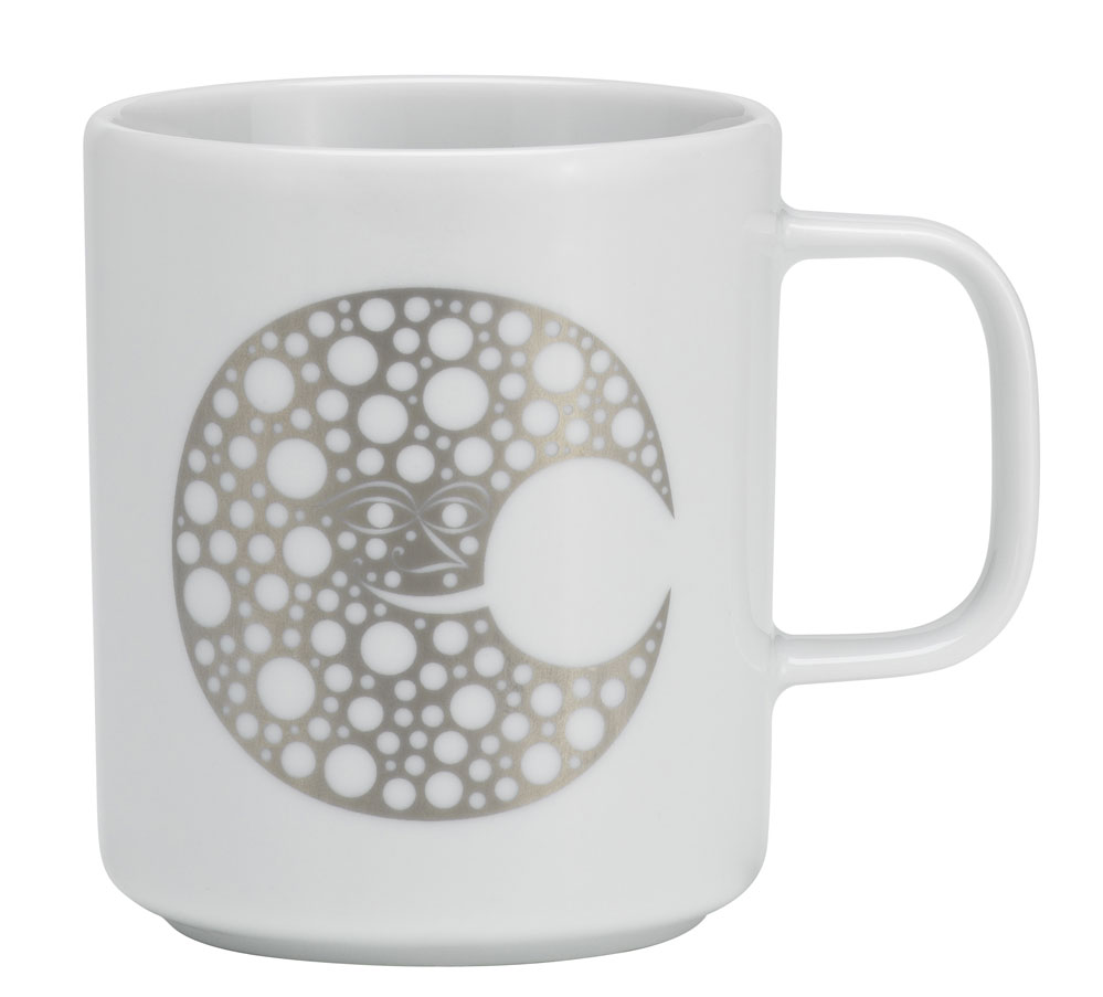 Das silberfarbige Dekor der Kaffeetasse Moon basiert auf dem grafischen Werk von Alexander Girard. Als Innenarchitekt entwarf Alexander Girard zahlreiche Restauranteinrichtungen (besonders bekannt ist das La Fonda De Sol in New York), wobei er häufig auch die Details wie Speisekarten, Streichholzbriefchen, Geschirr oder Servietten mitgestaltete. Diese vielfältige Welt war Ausgangspunkt und Inspiration für Vitras Auswahl der Coffee Mugs.