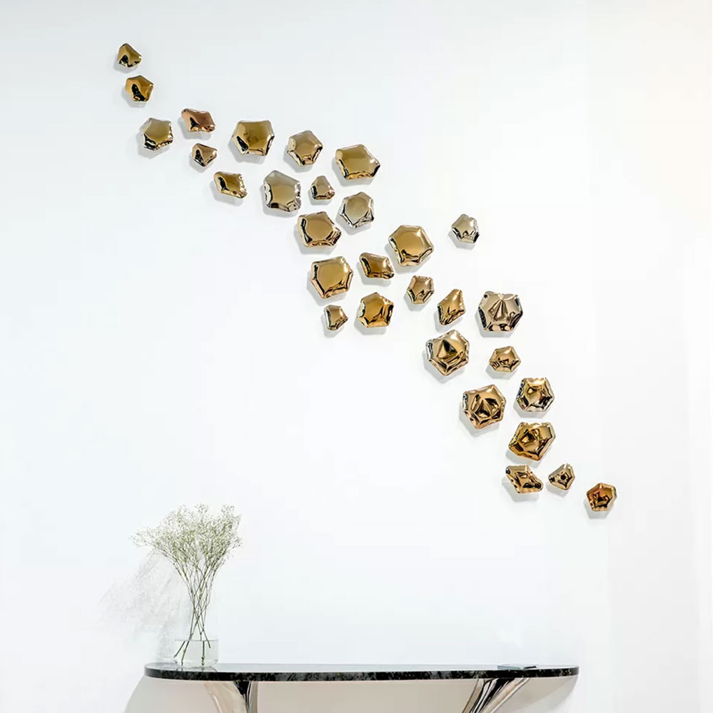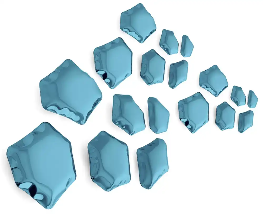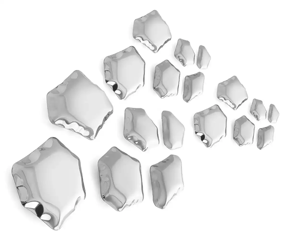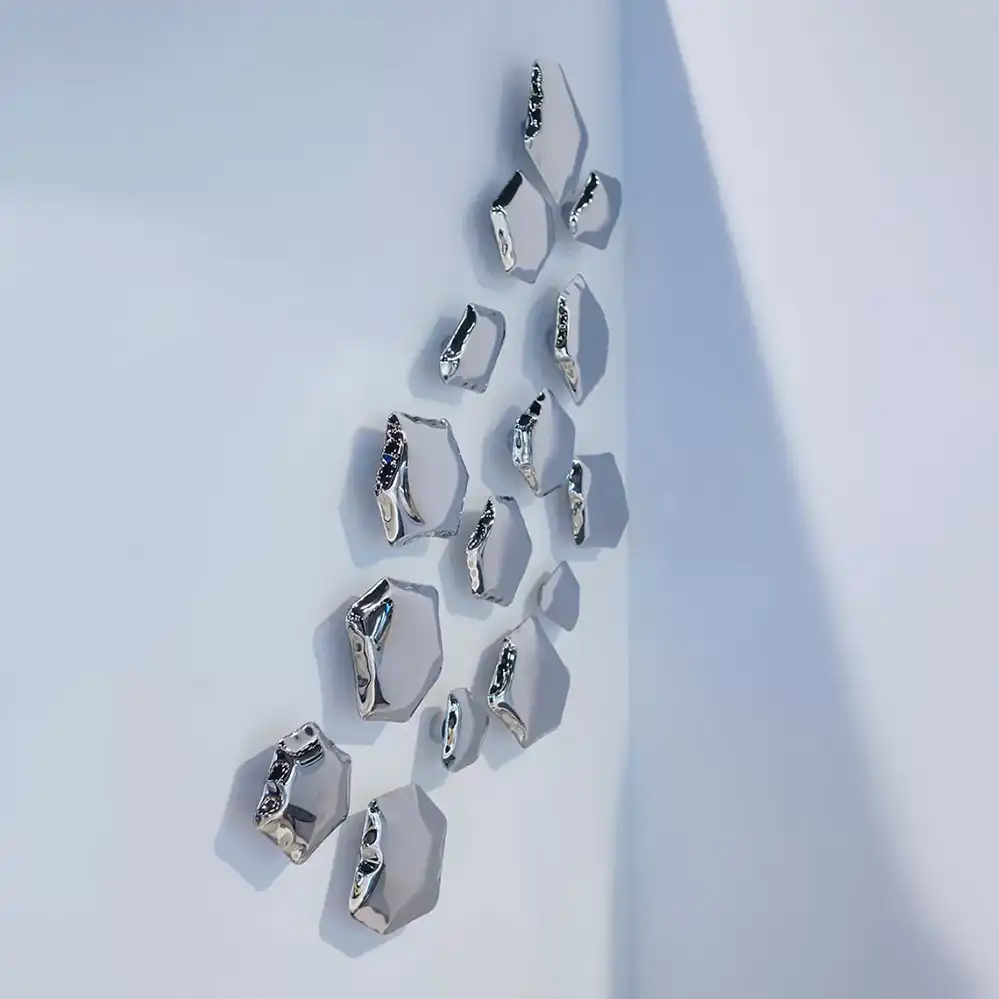 Das 18eilige Kamyki von Oskar Zięta ist Bestandteit der gleichnamigen Serie von dekorativen Wandobjekten mit unterschiedlichen Formen.. Die zufällig verteilte Konstellation der gänzenden Mteallobjekte erweckt den Eindruck einer gut durchdachten Komposition. Gedacht sind Kamyki als Dekoration oder Kunstwerk für Empfangsbereichen, Lobbys, Büros oder außer gewöhnlichen Inneneinrichtungen. I Durch die aufwendige Polierung erhält der verwendete Inox-Edelstahl die typisch spiegelnde Oberfläche. Erhältlich sind die Kamyki Objekte bei Markanto aus poliertem Edelstahl, Varianten in Carbon oder anderen Farben gerne auf Anfrage.