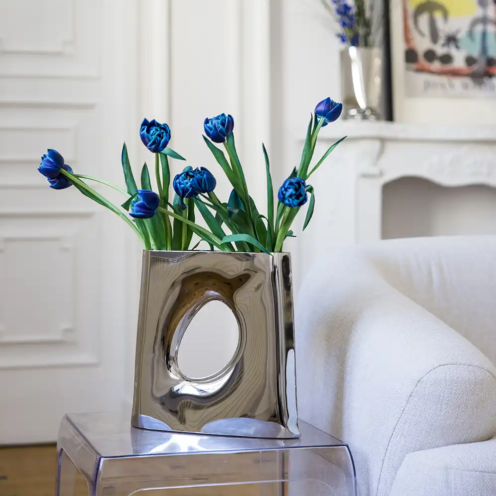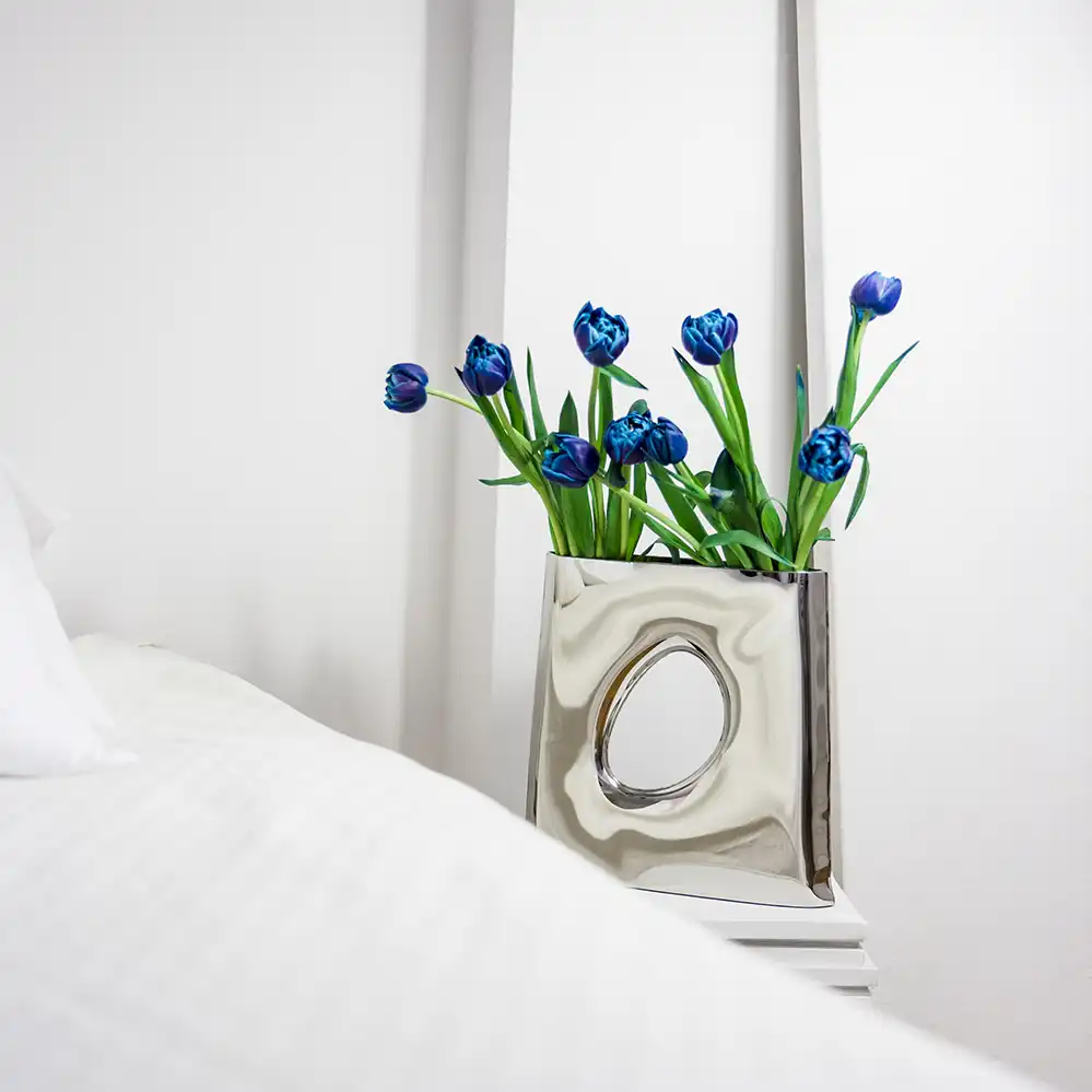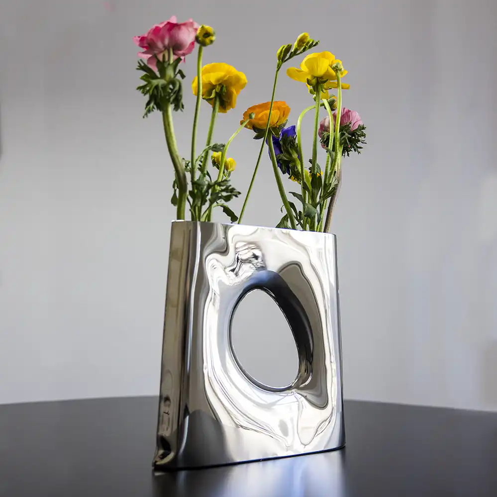 Die Karava Design-Vase von Zieta Studio definiert Blumenpräsentation neu. Ihre trapezförmige Geometrie mit elegantem ovalem Ausschnitt verwandelt die traditionelle Vasenform in ein skulpturales Kunstobjekt. Mehr als nur ein Behältnis für Blumen, ist die Stahlvase ein dynamischer Spiegel des Raumes, der Licht einzigartig reflektiert und Blumenarrangements in einer nicht-standardisierten Anordnung präsentiert. Mit der innovativen FiDU-Technologie (Inox) gefertigt, verkörpert die Karava Vase die Grenzen der Metallverformung. Ihre stabile Konstruktion und unkonventionelle Form machen sie zu einem Blickfang in jedem modernen Interieur.