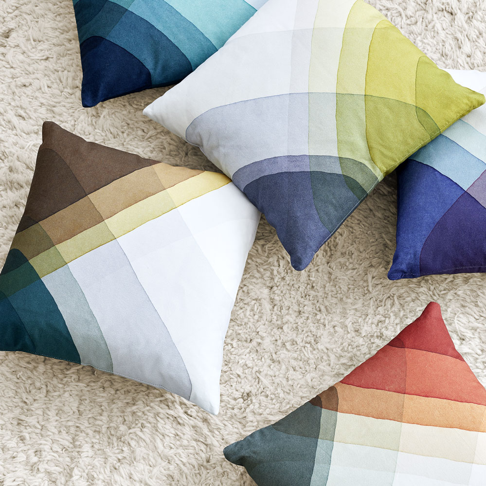 Die Herringbone Pillows des Designduos Raw-Edges vermitteln mit ihren geometrisch wirkenden Mustern Frische und Fröhlichkeit. Die sich überschneidenden und überlagernden Streifen von unterschiedlicher Farbintensität sind durch mehrmaliges Eintauchen in jeweils verschiedene Farben erarbeitet und dann als exakte Vorlage für den Druckprozess der Kissen übernommen worden.