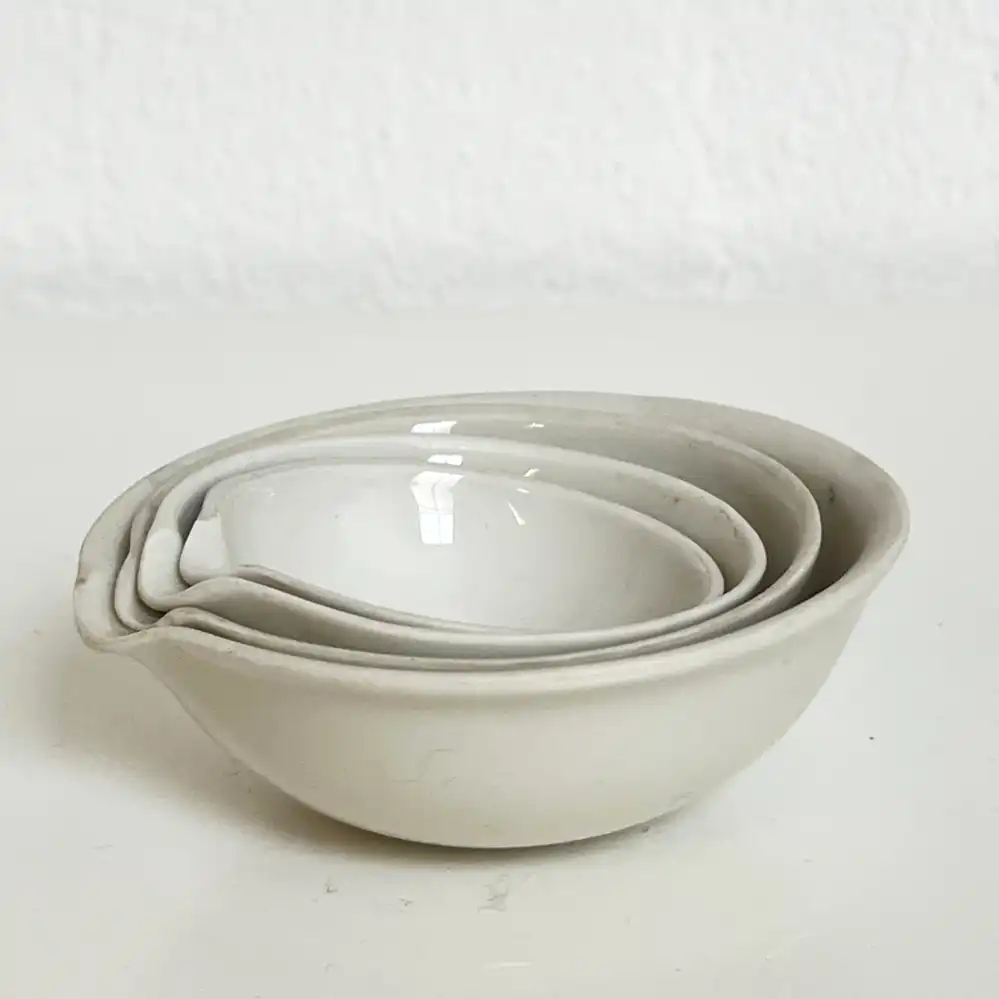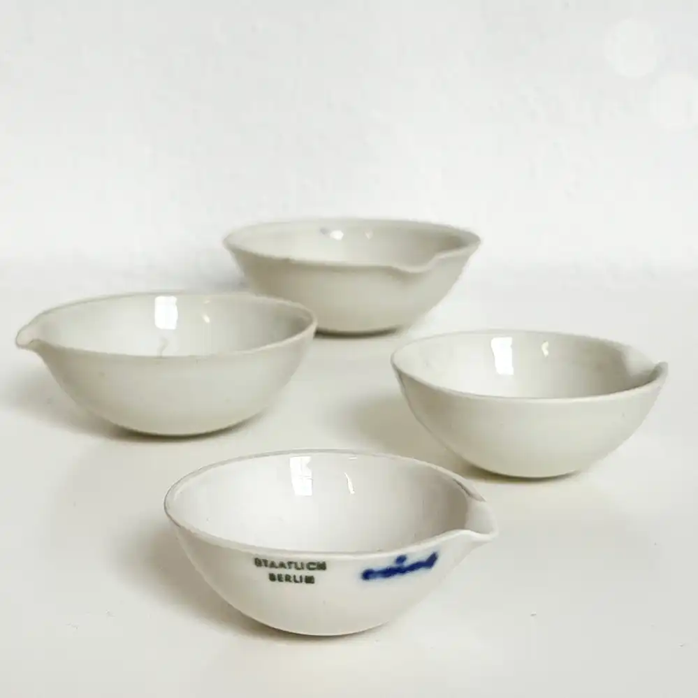 Die vier kleinen Laborschalen mit Ausguss von KPM stammen wohl aus den 1960er Jahren, der Preis gilt für das vierteilige Set.