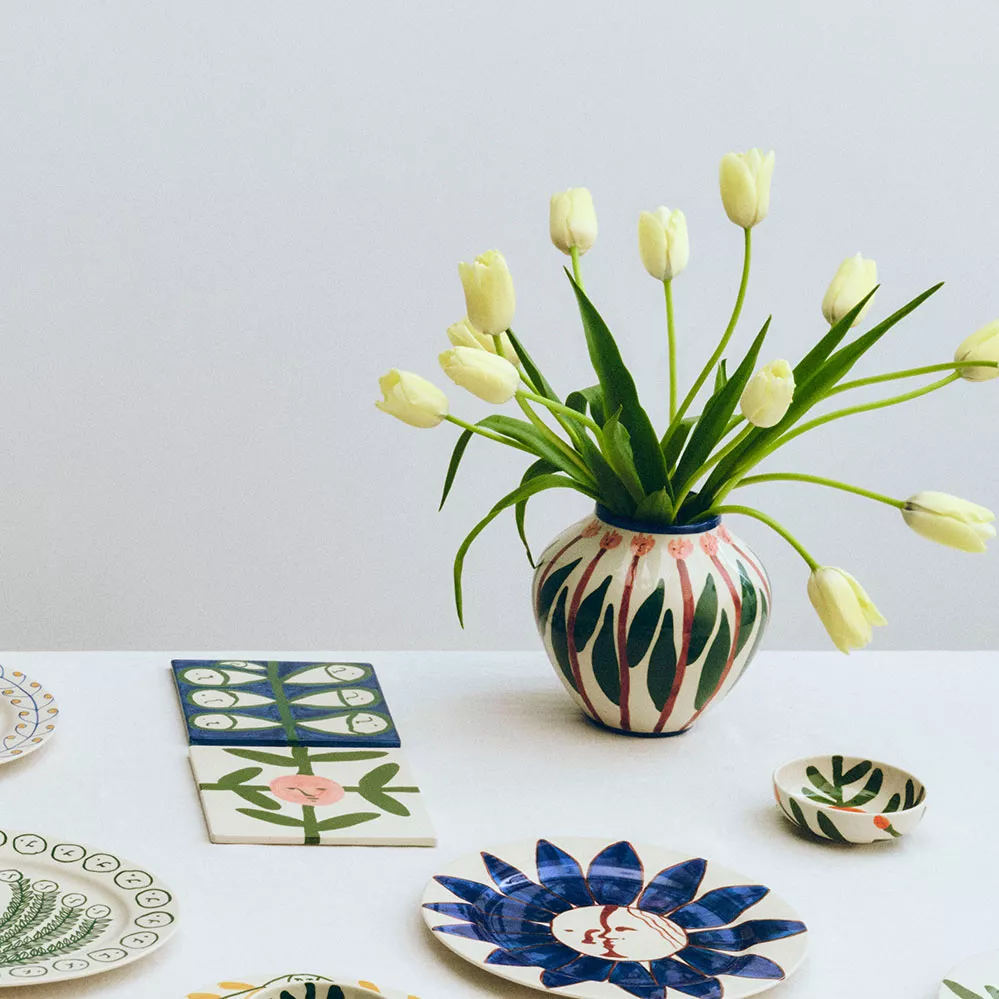 Die 1989 geborene Künstlerin Emma Kohlmann lebt und arbeitet in Massachusetts. Ihr Werk umfasst Zeichnung, Malerei, digitale Kunst und Literatur. Charakteristisch ifür ihre Arbeit ist Tusche und Aquarell – Techniken, die ihr erlauben, ein stetig wachsendes, intuitives Œuvre zu entwickeln. Aufgewachsen in der Bronx und zunächst im Tanz verortet, studierte sie am Hampshire College in Massachusetts Philosophie und feministische Theorie. Als Mitbegründerin von Mundus Press setzt sie sich gemeinsam mit ihrer Schwester für faire, kollaborative und erschwingliche Publikationen ein. Emma Kohlmann Arbeiten wurden in internationalen Einzel- und Gruppenausstellungen gezeigt und ihr charakteristischer Stil – organisch, poetisch, leicht naiv und zugleich subversiv – ist weltweit erkennbar. Für HAY überführt Emma Kohlmann diesen Stil erstmals in eine Keramikkollektion.