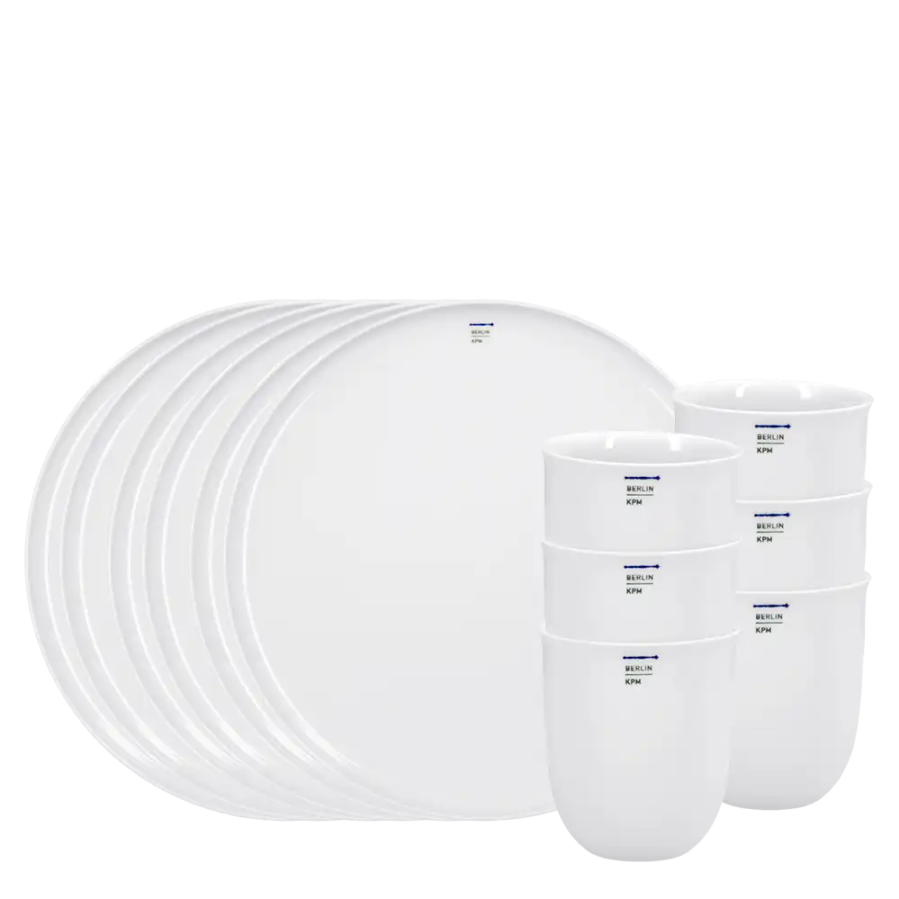 Das 12teilige LAB Frühstück-Set besteht aus 6 flachen Tellern sowie 6 Bechern No. 1. Das Set zählt zur sogenannten LAB-Serie von KPM. Diese Serie ist vom LABorbereich der Manufaktur inspiriert, denn vom 18. bis zum Ende des 20. Jahrhundert produzierte KPM zahlreiche technische Kolbengefäße, Tiegel und Schalen mit funktionalen Formen und Charakter. Das Laborporzellan geriet allerdings in Vergessenheit, bis Thomas Wenzel, Art Director der KPM, es wiederentdeckte und als Gebrauchsporzellan zu neuem Leben erweckte. Die LAB-Serie ist sehr vielseitig und umfasst neben verschiedenen Tassen, auch To-Go Becher, Tisch- und Frühstückssets, Schalen und Vasen bis hin zu Seifenspendern und anderen Objekten.