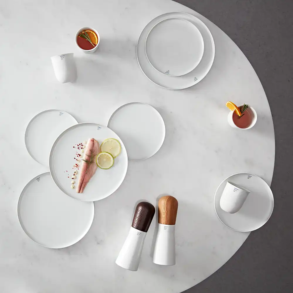 - 6teiliges Set bestehend aus: 2 flache Teller, ø 19 cm, 2 Schalen, ø 19 x 5,6 cm und 2xLAB Becher 2H, Durchmesser 9,3cm, Höhe 10,8 cm.