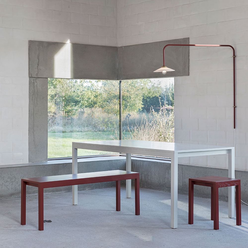 Die Wandleuchte Hanging Lamp n°5 mit geradem Ausleger zählt zu der viel beachteten Leuchtenserie von Muller Van Severen. Insgesamt umfasst die Serie fünf Leuchten, die alle in unterschiedlichen Farbvarianten erhältlich sind. Jede Leuchte wird dabei mit einer passsenden Wandhalterung geliefert, das Kabel ist weiß. Als Farben stehen blau, grün, creme, dunkelrot oder schwarz zur Auswahl. Zusätzlich ist die Wandleuchte Lamp n°5 in Messing oder seit 2025 verchromt erhältlich.