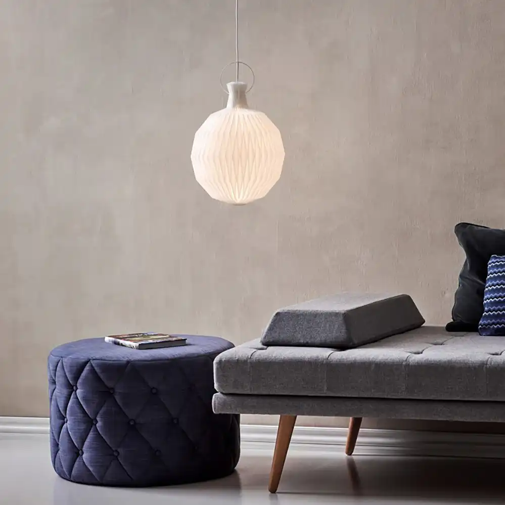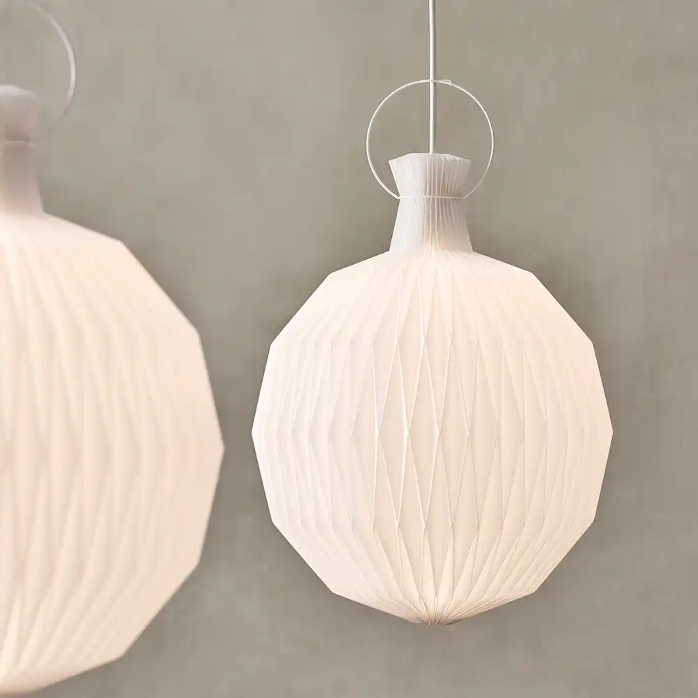 Die meisten Leuchtenmodelle von Le Klint sind mit einem faltbaren Papier- oder Kunststoffschirm erhältlich. Der handgefaltete Papierschirm erzeugt ein warmes Licht, hat eine lange Lebensdauer und wird im Laufe der Jahre eine schöne goldene Patina entwickeln. Der Kunststoffschirm hat ebenso eine lange Haltbarkeit, sorgt für eine gleichmäßigere Lichtdurchlässigkeit und ist leichter zu reinigen. Die von Le Klint verwendete Folie ist UV-beständig, antistatisch und behält die weiße Farbe über viele Jahre hinweg bei.