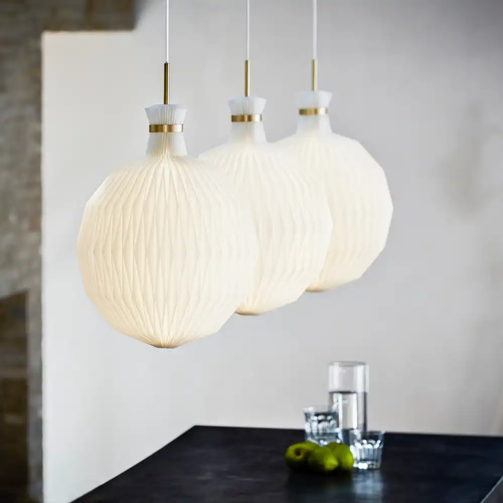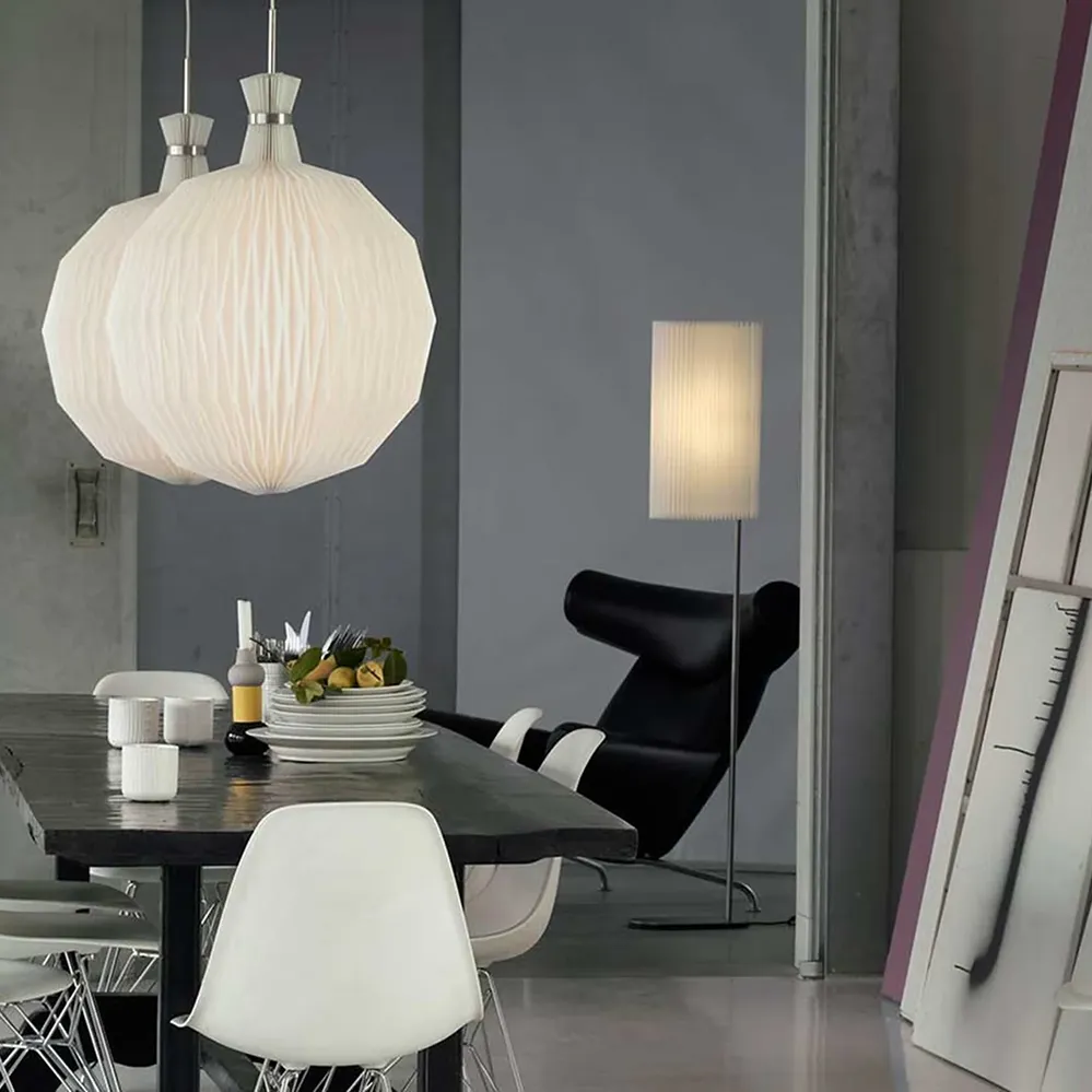 Die meisten Leuchtenmodelle von Le Klint sind mit einem faltbaren Papier- oder Kunststoffschirm erhältlich. Der handgefaltete Papierschirm erzeugt ein warmes Licht, hat eine lange Lebensdauer und wird im Laufe der Jahre eine schöne goldene Patina entwickeln. Der Kunststoffschirm hat ebenso eine lange Haltbarkeit, sorgt für eine gleichmäßigere Lichtdurchlässigkeit und ist leichter zu reinigen. Die von Le Klint verwendete Folie ist UV-beständig, antistatisch und behält die weiße Farbe über viele Jahre hinweg bei.