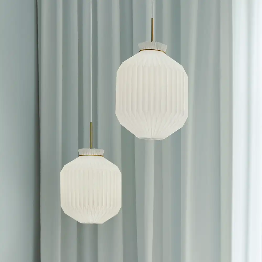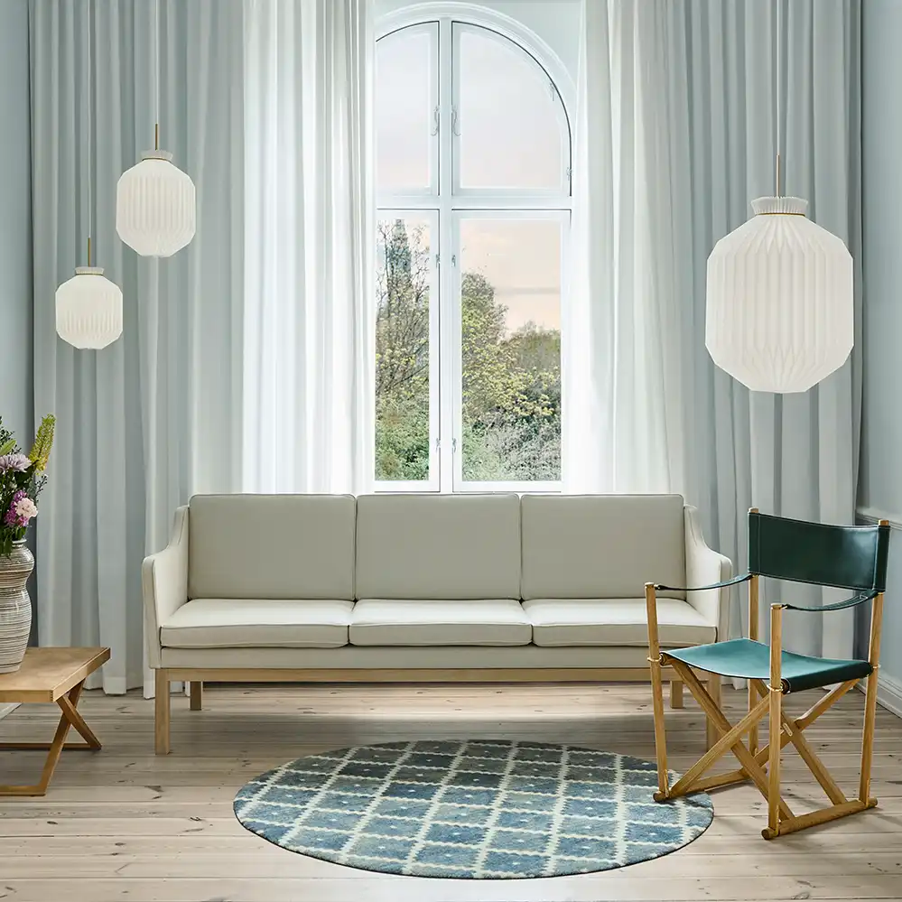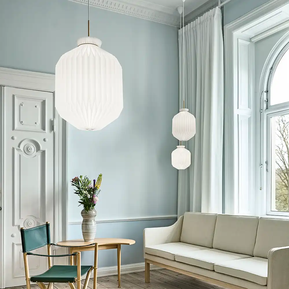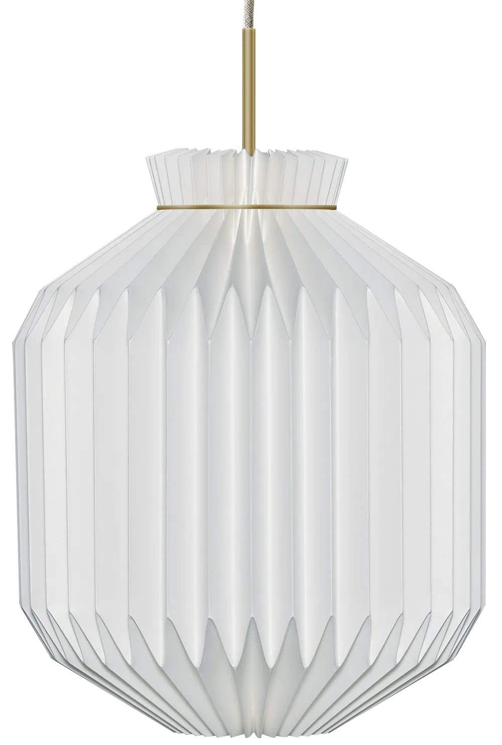 Im Jahr 1942 entwarf Mogens Koch das Modell 105 für eine dänische Handwerksausstellung in Stockholm und legte mit seinem Pendelleuchter einen wichtigen Grundstein für die für Le Klints ikonischen gefalteten Leuchten. Die ovale Silhouette verleiht dem Modell 105 eine ruhige, harmonische Ausstrahlung und erinnert in ihrer Form an klassische japanische Papierlaternen. Durch die geschlossene Gestaltung eignet sich die Leuchte besonders gut für hohe Decken. Heute ist die Pendelleuchte in zwei Standardgrößen sowie in zwei XL-Varianten (auf Anfrage) erhältlich – jeweils mit einer Aufhängung aus Messing.